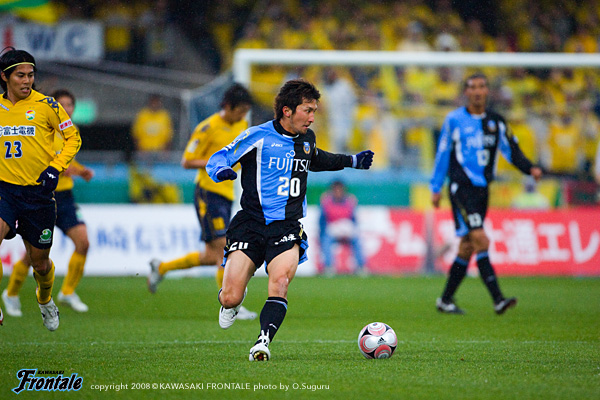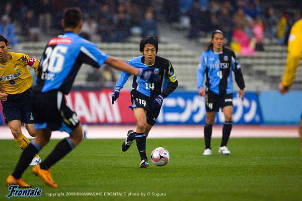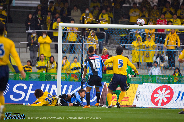 スターティングメンバーは2トップにテセと久木野、トップ下に大橋。中盤は中村と谷口のダブルボランチ、右に森、左に山岸。伊藤-寺田-井川の最終ライン、GK川島。代表メンバーが帰ってきたものの、ジュニーニョ、我那覇、黒津と、FWが怪我で出場できず。サブはMF登録の選手とDF、GKのみと苦しいメンバー編成。だが試合開始早々、フロンターレにゴールシーンが生まれる。2分、相手陣内で挟み込んでボールを奪ったテセが左サイドから中央に切れ込みながらミドルシュート。これがDFに当たってGKの頭上を超え、ゴールに吸い込まれる。(1-0) この先制ゴールで一気に試合運びが楽になったフロンターレ。9分、千葉の攻撃をしのいでルーズボールを拾った山岸から大橋へ。カウンターを狙うが、ここはファールで止められる。ともに3-5-2で選手個々がマッチアップする試合展開。球際での激しい攻防が続く。試合を優勢に進めるのはフロンターレだが、流れがきている時間帯で追加点を奪いたいところ。千葉もサイドを使った攻撃でゴールを狙う。16分、17分と千葉にセットプレーを与えるが、いずれもゴール前でクリア。