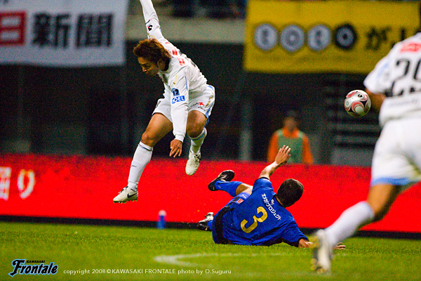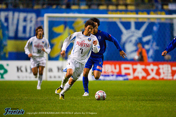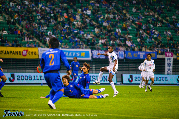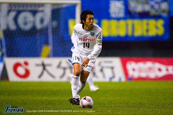 フロンターレのスターティングメンバーは2トップにジュニーニョとテセ、中盤は前目右に中村、左に谷口、中盤底にスタメン初出場の菊地。右アウトサイドに森、左に山岸、最終ラインは伊藤-寺田-井川、GK川島。1分、大分のペナルティーエリア左からのフリーキック。エジミウソンから危険なボール入るが、テセが足を伸ばしてクリア。2分、フロンターレの攻撃。菊地が空中戦で競り合い、こぼれ球を拾った中村からジュニーニョにつながり、右サイドの森がクロスを入れるが、ゴール前でクリアされる。3分、大分の攻撃。左サイドからアーリークロスを入れられるが、ゴール前で寺田が足を伸ばし、こぼれ球を井川がカバー。4分、フロンターレの攻撃。菊地をかわした金崎にシュートを打たれるが、これはGK川島の正面。厳しい球際のディフェンスで大分の攻撃を食い止めて反撃。7分、右サイドの森からパスを受けたテセが深い位置からラストパスを送るが、ゴール前のジュニーニョの手前でクリアされ、惜しいチャンスを逃す。ロングボールを入れてくる大分だが、菊地が高い打点のヘッドではね返す。キープレーヤーのジュニーニョ、中村に対して厳しくチェックをかける大分。14分、ジュニーニョにタックルをかけた深谷がイエローカード。15分、フロンターレのセットプレー。ペナルティーエリア右前から中村がボールを入れ、ゴール前の伊藤が折り返すがクリアされる。しかし、セカンドボールを拾った伊藤に深谷がタックル。2枚目のイエローカードを出されて退場処分に。早い時間帯でフロンターレが数的優位な状況となる。