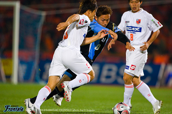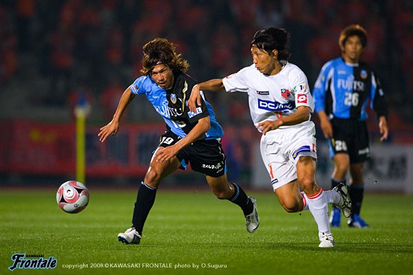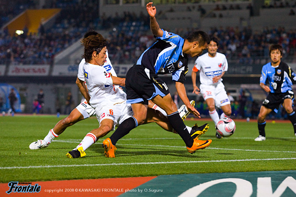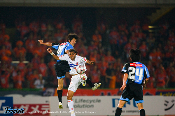フロンターレのスターティングメンバーはジュニーニョ、テセの2トップ。中盤は底に中村、その前に大橋と谷口。右ワイドに森、左に山岸。伊藤-寺田-横山の3バック、GK川島。最初にしかけたのはフロンターレ。1分、中盤でボールをカットした中村から大橋、ジュニーニョとつながり、ジュニーニョがミドルシュート。しかし、これは惜しくもゴール右へと外れる。序盤からお互いに速い攻撃を狙う展開が続く。7分、フロンターレのセットプレーをしのいだ大宮のカウンター。左サイドからクロスが入り小林大にシュートを打たれるが、ゴール上に外れてことなきを得る。10分、フロンターレの決定機。スローインの流れからこぼれ球を拾った森のクロスにテセが飛び込むが、ヘディングシュートはゴール上へと外れる。ボールをつないでワイドに展開するフロンターレに対して、シンプルに最終ライン裏のスペースを狙う大宮。16分、フロンターレの攻撃。左サイドから右へと展開し、森がミドルシュート。しかし、これは惜しくもゴール右に外れる。18分には、ペナルティエリア前のフリーキックのチャンスに大橋が直接ゴールを狙うが、シュートはわずかにゴール右上に外れる。20分、ルーズボールを山岸がダイレクトでスルーパス。反応したジュニーニョが裏のスペースに走り込むが、このプレーは惜しくもオフサイド。攻撃の形はできているが、ラストパス、フィニッシュのところで大宮ディフェンスに止められてしまう。