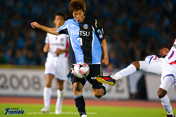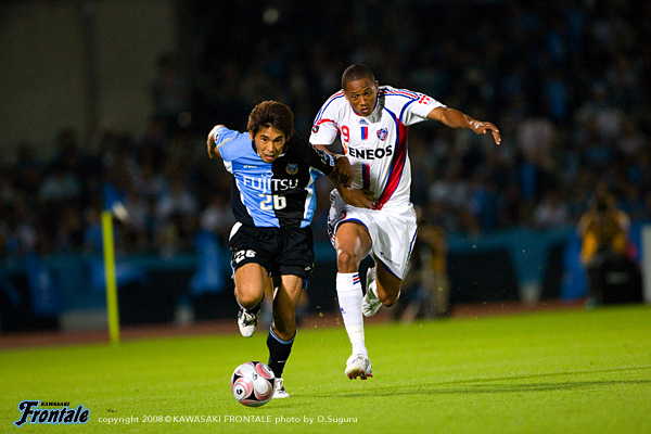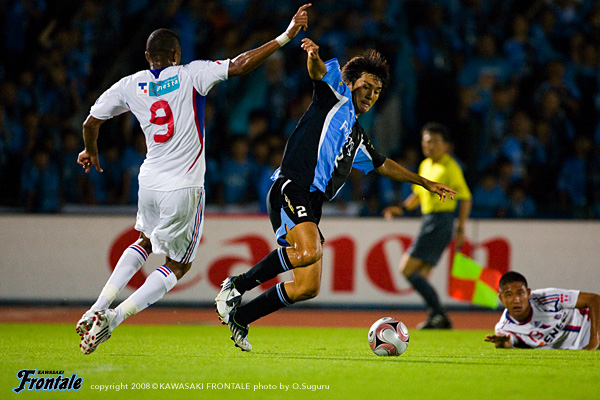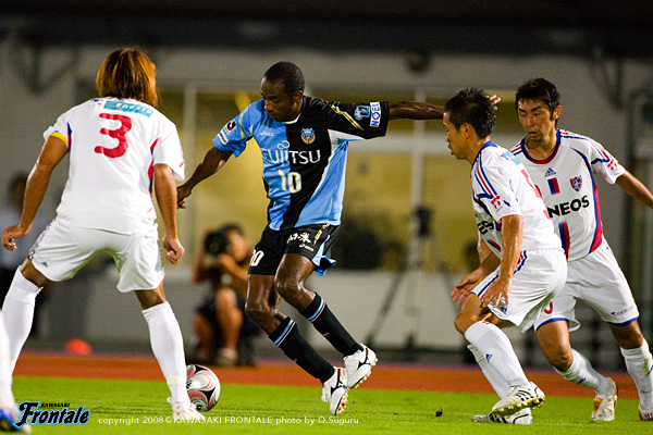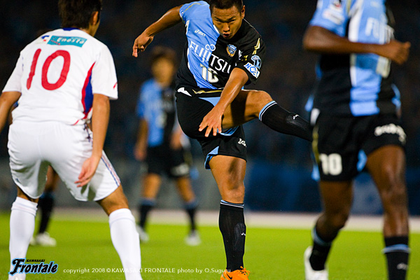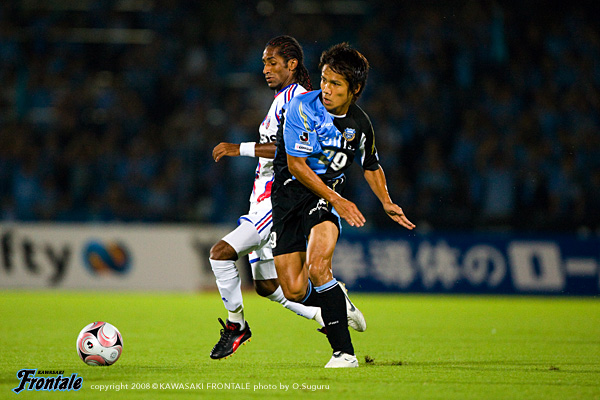 フロンターレのスターティングメンバーは前節と同じ。最前線にテセ、左にジュニーニョ、右に黒津、トップ下にヴィトール、中村と谷口のダブルボランチ、山岸-伊藤-井川-村上の4バック、GK川島。立ち上がりから積極的にしかけるフロンターレ。1分、ヴィトール、ジュニーニョ、テセのコンビネーションでゴールに迫るが、フィニッシュにはつなげられず。3分にはコーナーキックのクリアボールを村上が拾い、中村の右サイドからのクロスを受けたジュニーニョがシュートを狙うが、惜しくもDFに当たってゴールをそれてしまう。さらにヴィトールからの左コーナーキックにジュニーニョが頭で合わせるが、シュートはゴール右に外れる。しかし迎えた5分、リスタートの一瞬のスキを突かれてFC東京のコーナーキックに。徳永のコーナーキックがゴール前でこぼれ、このボールをファーサイドで拾った赤嶺にフリーでシュートを決められ、ワンチャンスでFC東京に先制点を奪われてしまう。(0-1) だが、ボールを支配しているのはフロンターレ。相手陣内へと押し込み、9分、ジュニーニョからのパスを受けたテセが反転して強烈なミドルシュートを放つが、これは惜しくもクロスバー直撃。序盤から動きのある試合展開に。早い時間帯で追いつきたいが、ラストパス、フィニッシュの精度を欠き、ゴールを奪えず。15分、黒津がドリブルで勝負をしかけ、こぼれ球を拾ったテセがボールキープから折り返し。後ろから走り込んだヴィトールがダイレクトで左足を合わせるが、シュートはゴール左に外れる。18分、中盤でのミスパスを拾ってカウンターをかけるFC東京。カボレがドリブルでエリア内に入ってくるが、しのいで逆にフロンターレのカウンター。しかし、これはフィニッシュにはつながらず。逆に19分、今度はフロンターレの攻撃をしのいだFC東京がカウンターへ。しかし、ゴール前へのラストパスは山岸が戻りクリア。ピンチをしのぐ。激しい攻防が続くが、20分を過ぎたあたりからやや落ち着いた展開に。