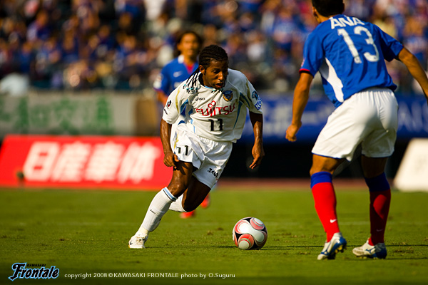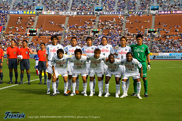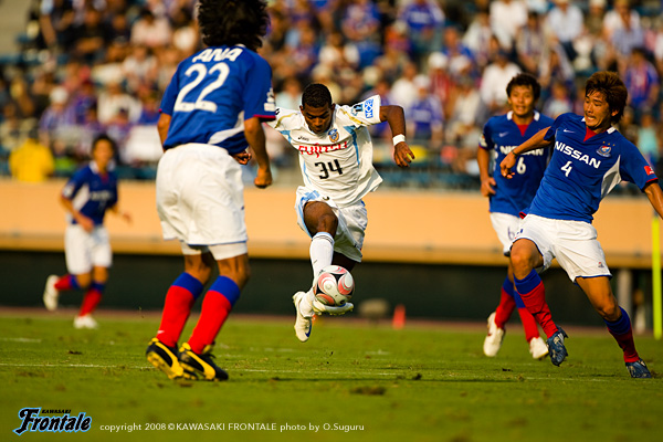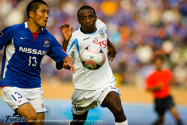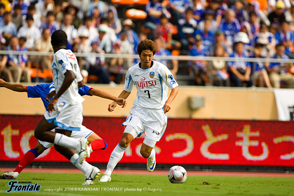 フロンターレのスターティングメンバーは前節と同じ。最前線にテセ、左にジュニーニョ、右に黒津、トップ下にヴィトール、中村と谷口のダブルボランチ、山岸-伊藤-井川-村上の4バック、GK川島。立ち上がり2分、フロンターレの攻撃。中央の中村からパスを受けた黒津が右サイド角度のないところから強烈なミドルシュート。しかし、これは惜しくもGKにセーブされる。4分には、自陣から中村がロングパス。裏に抜けたテセがDFを吹き飛ばしてシュートを放つが、飛び出してきたGKがセーブ。こぼれ球に詰めたジュニーニョも止められる。6分、横浜FMのカウンター。インターセプトしたボールを再び奪われ右サイドに展開され、田中がシュート性のグラウンダーのボールをゴール前へ。ファーサイドで坂田が足を出すが、これはわずかに届かずことなきを得る。9分、フロンターレのフリーキック。ペナルティエリア右前からヴィトールが直接狙うが、このシュートはゴール上に外れる。10分、横浜FMの攻撃。ロングボールからクリアボールを拾われ、坂田にミドルシュートを打たれるが、最終ラインがコースに入ってブロック。11分、フロンターレの攻撃。中村、ヴィトールと細かくパスをつなぎ、こぼれ球に詰めた黒津が左足を振り抜くが、ミドルシュートはGKにセーブされる。13分には、テセとのワンツーからケンゴが抜け出し、右サイドでパスを受けたジュニーニョがDFをかわして右サイド角度のないところから狙うが、シュート性のボールはゴール左に外れる。14分にも、パスをつないで中村がミドルシュート。ブロックされてこぼれたボールを拾ったテセが折り返しを入れるが、これもGKにセーブされる。16分、17分と横浜FMが連続してコーナーキックを得るが、ゴール前ではね返す。お互いにボールを奪ってから速い攻撃をしかける落ち着かない展開が続く。