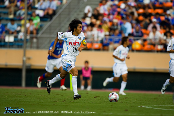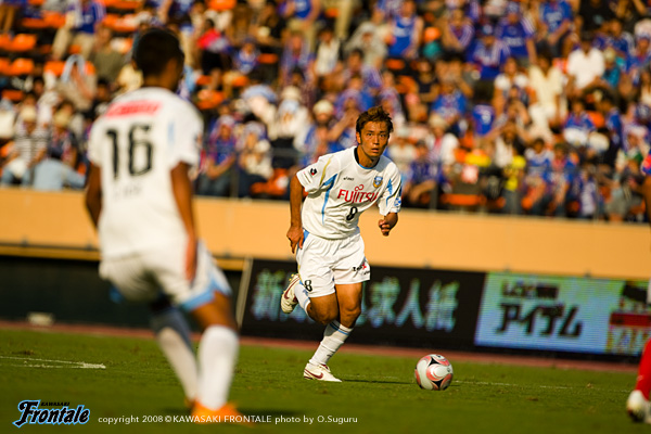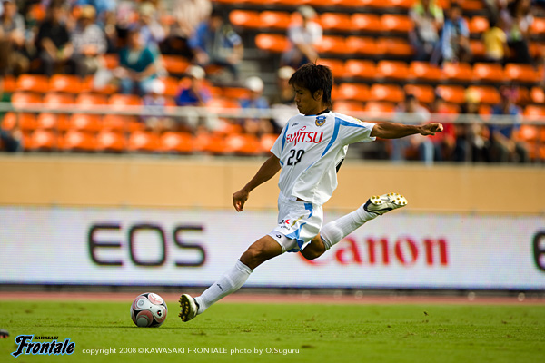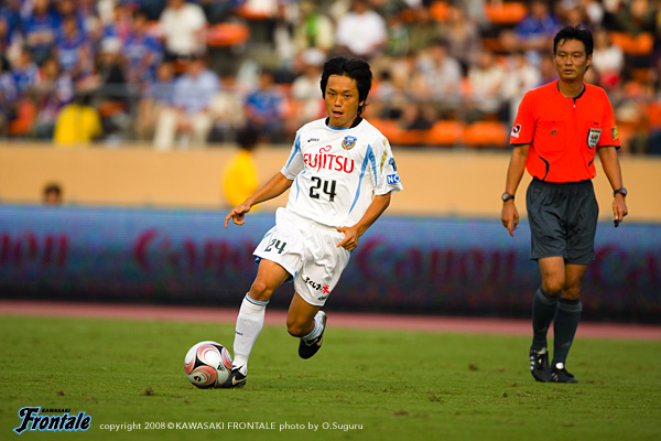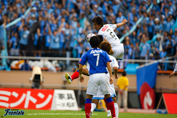 24分、横浜FMボールに中村が詰めて相手陣内で奪い、こぼれたボールを拾ったテセが右サイド角度のないところからシュートを狙うが、これは惜しくもクロスバー直撃。26分には、中盤でのボールカットからカウンターへ。黒津がドリブルをしかけてスルーパス。左サイドに抜けたヴィトールのクロスにジュニーニョが飛び込むが、わずかに頭には届かず。フロンターレが一方的に押してはいるものの、ゴールを奪えず。28分、フロンターレのフリーキック。右サイドからヴィトールがボールを入れ、ファーサイドに谷口が飛び込むが惜しくも届かず。32分にも横浜FMボールを奪ってカウンターへ。テセのポストプレーからヴィトールがミドルシュートを狙うが、これはゴール上に外れる。36分、横浜FMの攻撃をしのいでカウンターへ。伊藤→ジュニーニョとつながり、右サイドからテセがシュート。しかし、ここもGKにセーブされる。37分には山岸、38分には村上と、両サイドからも攻撃をかけてミドルシュートを狙うが、いずれもブロックされる。すると終盤、横浜FMが反撃。41分、河合が強烈なミドルシュートを放つが、ここはGK川島が好セーブ。しかし迎えた42分、横浜FMの右コーナーキック。狩野のキックを中澤にどんぴしゃのタイミングでヘディングを合わされ、先制点を奪われてしまう。(0-1) さらに43分、自陣ペナルティエリア内でボールを奪われピンチになるが、村上が体を張ってシュートブロック。何度もチャンスを迎えながら最後のところで横浜FMに守りきられ、逆に終盤やや運動量が落ちたところで反撃を受け、セットプレーから失点。フロンターレとしては非常に嫌なパターン。0-1で前半を折り返した。