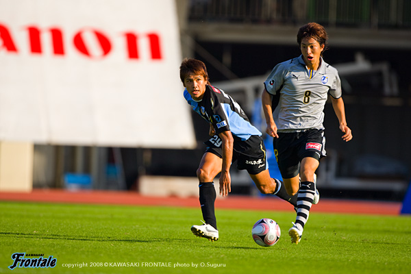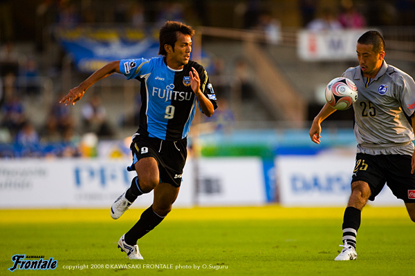 フロンターレのスターティングメンバーは前節と同じ顔ぶれ。テセが最前線に張り、ジュニーニョ、レナチーニョが自在にポジションチェンジ、1.5列目にヴィトール、中村と谷口のダブルボランチ、山岸-伊藤-寺田-井川の最終ライン、GK川島。両チームともに立ち上がりは守備から試合に入り、相手の出方を伺いながらチャンスを狙う。最初にしかけたのは大分。4分、フロンターレがコーナーキックのセカンドボールを拾ってカウンターに出るところを、中盤で奪い返して再攻撃。左サイドに流れた高松にクロスを入れられ、ゴール前に森島が入ってくるが、ここは伊藤がクリア。ピンチをしのぐ。フロンターレも反撃。7分、右サイドのレナチーニョからジュニーニョへ。テセのポストプレーからジュニーニョがゴール前に抜け出しループシュートを狙うが、ここはGKにキャッチされる。11分には、ヴィトールの右コーナーキックにファーサイドの伊藤がヘッドでGKの頭上を抜くが、これは惜しくもゴールラインぎりぎりでDFにクリアされる。互いに相手のスキを伺う緊迫した試合展開。セットプレーひとつでも両チームの集中力が伝わってくる。21分、フロンターレの左コーナーキック。ヴィトールからのボールをファーサイドで谷口が折り返し、ゴール前で大混戦に。相手GKともみ合い、両チームともにややエキサイト。すると24分、中盤でヴィトールからのパスを受けた中村が左足で前線へロングボールを入れる。このスペースに走り込んだレナチーニョが、マーカーに競り勝ち落ち着いてシュートを決めて先制点を挙げる。(1-0)