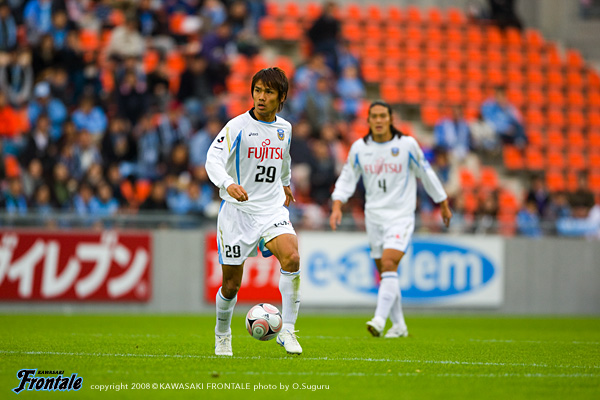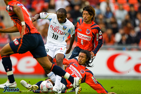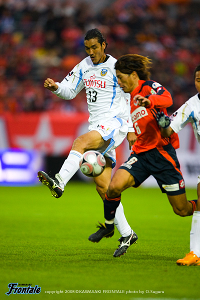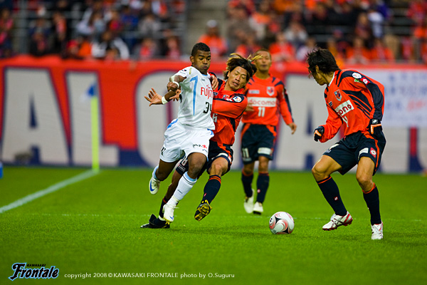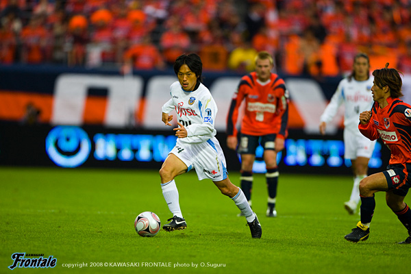 フロンターレのスターティングメンバーは、トップにテセ、右にレナチーニョ、左にジュニーニョ、トップ下にヴィトールが基本ポジション。中村と谷口のダブルボランチ。伊藤-寺田-井川-森の最終ライン。GK川島。立ち上がりからしかけてきたのは大宮。セカンドボールを狙い、ロングボールを使ってシンプルな速攻をかけてくる。2分、マイボールを奪われカウンターを受けるが、ここは森と寺田でカバー。さらにロングボール一発でカウンターを浴び、塚本の頭の折り返しを受けたラフリッチにシュートを打たれるが、井川がコースに入ってシュートブロック。攻守の切り替えが速い大宮。7分、藤本にドリブルで中盤からゴール前まで入り込まれるが、シュートはGK川島の正面。フロンターレも反撃。10分、中村のロングパスをテセが競り合い、こぼれ球にジュニーニョ詰め、さらにこぼれたボールにヴィトールが走り込むが、左足のミドルシュートはゴール右に外れる。14分、大宮の決定機。内田の左サイドからのフリーキックを富田が折り返し、ゴール前でラフリッチがシュート。しかし、このシュートはうまくミートせずことなきを得る。大宮の組織的なボールへの寄せにつかまり、なかなか自分たちのペースを握ることができないフロンターレ。18分、森のスローインをテセが落とし、右サイドからヴィトールがシュートを狙うが枠をとらえきれず。20分、大宮の攻撃。サイドチェンジから波戸に左サイドからクロスを入れられるが、裏に抜けたラフリッチはオフサイド。さらに21分、カウンターからレアンドロにスルーパスを出されるが、ここは中村が足を伸ばして触りピンチをしのぐ。フロンターレもようやくパスがつながりだすが、その矢先の26分、中盤でのパスミスからカウンターを受け、内田のラストパスを受けたラフリッチがフリーでシュート。これはポストに当たるがこぼれ球に詰めた藤本に押し込まれ、大宮に先制点を奪われてしまう。(0-1)