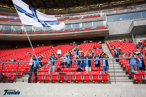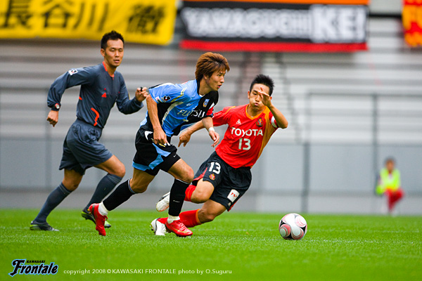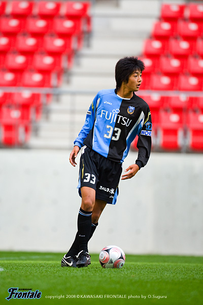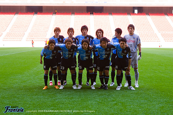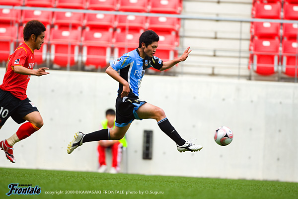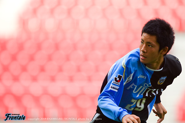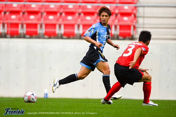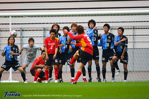 フロンターレのスターティングメンバーは、黒津とユースの山口の2トップ、中盤は久木野-木村-鈴木-杉浦の並び、最終ラインは全員ユースチームのメンバー、中林-苅部-金子-川越の4バック。GK杉山。立ち上がり4分、黒津がドリブルをしかけて山口へ。山口からパスを受けた木村が左サイドからシュートを狙うが、これはGKにキャッチされる。さらに6分、鈴木と木村のコンビネーションプレーでゴールに迫るが、惜しくもラストパスはつながらず。9分、名古屋のフリーキック。井上のボールにバヤリッツァがヘッドで合わせるが、このシュートはポスト直撃。ことなきを得る。11分、フロンターレのセットプレー。右サイドから木村がクロスを入れ、ルーズボールを久木野が狙うが、シュートはDFにブロックされる。13分にはペナルティエリア前の絶好の位置からのフリーキックのチャンスで木村が直接狙うが、シュートはわずかにゴール左に外れる。ロングボールを入れてサイドから攻撃を狙う名古屋に対し、最終ラインと中盤で挟み込んで粘り強く相手の攻撃をしのいでいく。フロンターレもセットプレーのチャンスを得るが、名古屋ディフェンスを崩しきれない。22分、右サイドからボールをつなぎ木村がドリブル突破。そして黒津からパスを浮けた杉浦が左足でミドルシュートを狙うが、これはGK正面。34分には、名古屋の攻撃をしのいで速攻へ。杉浦のサイドチェンジを受けた久木野が右サイドから折り返し。このボールに反応した杉浦がダイレクトでミドルシュートを狙うが、これはゴール右上に外れる。組織ディフェンスで名古屋の攻撃をはね返していくディフェンス陣。裏のスペースへのボールもGK杉山が対応。前半を0-0で折り返した。