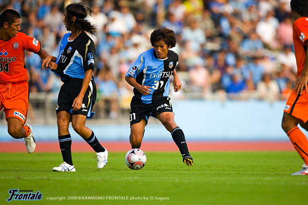 後半、怪我明けの寺田と森に代えて養父、吉田がピッチへ。原田-養父のダブルボランチ、吉田-菊地-横山-田坂の4バックへとシフト。47分、フロンターレの攻撃。レナチーニョがドリブルをしかけてシュートを放ち、こぼれ球を拾った大橋が左サイドから折り返し。ゴール前で久木野が頭で合わせるが、このシュートは惜しくもGKにキャッチされる。49分には、右サイドの田坂からボールを受けた久木野がドリブルから折り返し。このボールを受けた我那覇が右サイド角度のないところから狙うが、シュートはサイドネット外側に外れる。清水も反撃。51分、右サイドのスペースを狙われ、辻尾にクロスを入れられるが、GK杉山が飛び出しボールに触りピンチを防ぐ。55分、フロンターレのフリーキック。中盤左サイドから大橋がクロスを入れ、DFがクリアしたボールが清水ゴールに向かうが、GKがセーブ。56分にはバックパスにレナチーニョが詰めるが、惜しくもボールを奪えず。57分、清水のカウンター。一気にゴール前にボールを運ばれるが、横山が体を入れて食い止める。迎えた59分、レナチーニョが中盤でボールカット。すぐさま左サイドに流れていた大橋にパスを送り、大橋がグラウンダーの折り返し。ここにレナチーニョが走り込み、ダイレクトでゴールを決めて先制点を挙げる。(1-0) 63分にもレナチーニョが中盤から単独で勝負をしかけてシュートに持ち込むが、惜しくもゴールならず。64分ゴールを決めたレナチーニョに代えて木村がピッチへ。大橋がひとつポジションを上げる。66分、清水の攻撃。左サイドを崩されクロスが入り、こぼれ球を拾った原に決定的なシュートを打たれるが、これはゴール上に外れる。清水も徐々に前がかりになってくる。しっかりとボールを回しながら追加点を狙うフロンターレ。71分、我那覇に代えて杉浦がピッチに入り、そのままトップの位置へ。72分、清水のカウンター。左サイドから高木にシュートを打たれるが、枠を外れてことなきを得る。その後は暑さもあって両チームともに運動量が落ちてくる。フロンターレが押しているものの、清水もサイドを使った攻撃でしかけどころを狙う。81分、清水の攻撃。サイドチェンジから左サイドを崩され、永畑にシュートを打たれるが、これはポストに外れる。迎えたロスタイム、自陣でのルーズボールがゴール前に転がり、このボールに反応した原にシュートを決められ、土壇場で追いつかれてしまう。(1-1) しかし、ラストプレーのフロンターレの右コーナーキック。大橋からのボールをファーサイドで田坂がヘッドで折り返し、養父が詰めてこぼれたボールに菊地が反応。ゴールをねじ込み勝ち越しゴールを奪う。(2-1)