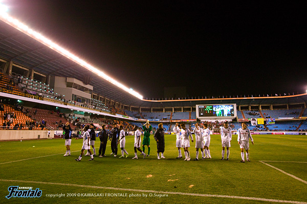 74分、左サイドへの展開から中央に戻され、ファン・ジンソンにミドルシュートを打たれるが、これはゴール右に外れる。その後も一進一退の攻防が続く。79分、浦項の攻撃。左サイドからのコーナーキックは黒津がクリア。80分には中盤からファン・ジェウォンに意表を突いたロングシュートを打たれるが、ここはGK川島が冷静にパンチング。81分、浦項の攻撃をしのいでカウンターへ。中村の縦パスを黒津だダイレクトで裏のスペースへ。ここにジュニーニョが走り込むがGKが飛び出しクリア。あと一歩というところだった。82分、浦項の攻撃。右サイドを崩されクロスが入るが、ゴール前で寺田がカバー。83分、村上に代えてレナチーニョを投入。菊地がセンターバックに下がり、伊藤が左サイドバックへ。86分、浦項の攻勢をしのいで反撃。黒津がDFをかわしてジュニーニョへ。ジュニーニョがドリブルをしかけるが、シュートはゴール右に外れる。終盤はさらにオープンな展開へ。前に選手を残し、パワープレーでゴール前にロングボールを入れてくる浦項。ボールを奪ってカウンターをかけたいフロンターレ。89分、フロンターレの攻撃。ペナルティエリア前でのフリーキック、中村が打つと見せかけヴィトールが直接狙うが、シュートはゴール上に外れる。ロスタイム4分。浦項の攻撃。パワープレーからナムグン・ドにミドルシュートを打たれるが、これはゴール上に外れてことなきを得る。前へ前へとボールを入れてくる浦項。ロングボールで押し込まれるが体を張ってゴールを守り、1-1のままタイムアップ。