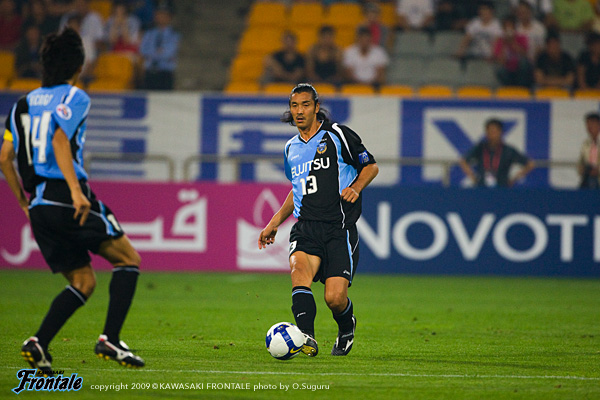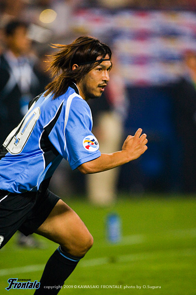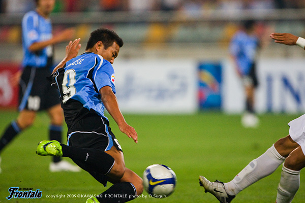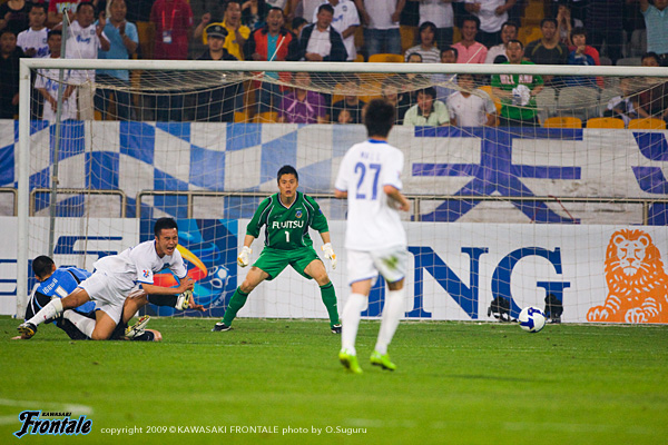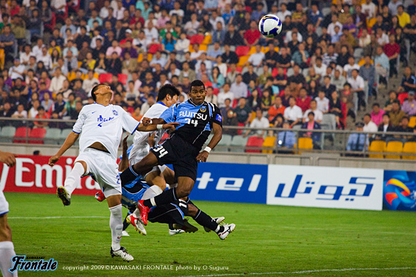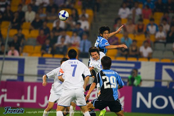 22分、フロンターレの攻撃。ヴィトールの右コーナーキックをジュニーニョがヘッドで合わせるが、ゴールラインぎりぎりでクリアされ、こぼれ球に田坂が詰めるが、シュートはゴール右に外れる。天津の激しいボールチェックに苛立つ攻撃陣。試合は荒れ模様の様相に。27分、天津の攻撃をしのいでカウンターへ。村上からボールを受けたヴィトールが左サイドから折り返し、ジュニーニョがシュートを放つがDFブロックされる。30分、天津の攻撃。ハン・ヤンミンのフリーキックがゴール前に流れるが、ここは谷口がクリア。32分、GK川島のロングボールをテセがヘッドで流してジュニーニョがシュートを放つが、ゴール右に外れる。39分、パスをつないで田坂がドリブルをしかけるが、ファールで止められる。40分にはヴィトールの右コーナーキックをファーサイドで谷口が左足で合わせるが、シュートは枠をとらえきれず。一番やってはいけない自陣でのミスからの失点。このゴールでムードは一気に天津の流れになってしまった。天津はファールも辞さない激しいプレーをしかけてくる。挑発に乗っては相手の思うつぼになってしまう。0-2のビハインドで前半を折り返した。