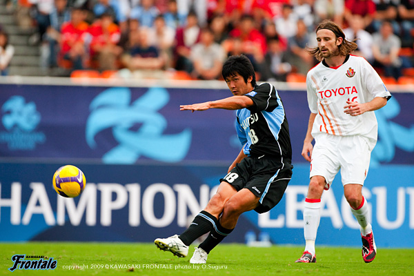 迎えた27分、ロングパスから右サイドに展開され、マギヌンからボールを受けた中村がクロス。ケネディにヘッドで合わされ、先制点を奪われる。(0-1) 30分、フロンターレの攻撃。菊地からタテパスを受けた中村がスルーパス。ジュニーニョがドリブルをしかけるが、ここはファールで止められる。さらに31分、右サイドからのコーナーキック。中村からのボールをニアサイドで伊藤がすらしてジュニーニョが飛び込むが、わずかに届かず。32分、名古屋の攻撃。ロングボールのこぼれ球を玉田が左サイドから折り返し。ゴール前にマギヌンが飛び込んでくるが、菊地がコースに入りカバー。35分、フロンターレの攻撃。右サイドでボールをつなぎ、井川からパスを受けたジュニーニョがレナチーニョへ。中央に切れ込んだレナチーニョが左足を振り抜くが、このシュートはうまくミートせずGKがキャッチ。38分、名古屋のカウンター。右サイドからのスルーパスにケネディが走り込んでくるが、GK川島が飛び出しキャッチ。直後のプレー、一瞬のスキを突いてスルーパスにジュニーニョが抜け出すが、左足のシュートは惜しくもGKにセーブされる。さらに40分、中村のロングボールを受けたジュニーニョが粘ってシュートまで持ち込むが、惜しくもDFにブロックされる。41分にはコーナーキックのこぼれ球を拾った森がシュート、ブロックされたボールを拾ったジュニーニョもDFにブロックされる。さらに中村からの右コーナーキックにテセがヘッドで合わせるが、このシュートは惜しくもクロスバーに当たって外れる。44分、名古屋の攻撃。小川のフリーキックのこぼれ球がゴールに向かうが、ここはGK川島がキャッチ。ことなきを得る。ロスタイム、名古屋のカウンターを浴び、左サイドのマギヌンのクロスをケネディにヘッドで合わされるが、このシュートはゴール右に外れる。序盤はお互いに堅守速攻を狙う堅い展開となったが、名古屋の得意な形から先制点を許してしまった。フロンターレも決定機はあるものの決めきれず、前半を0-1で折り返した。
