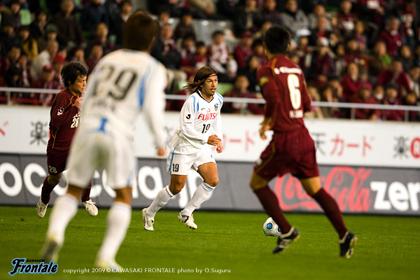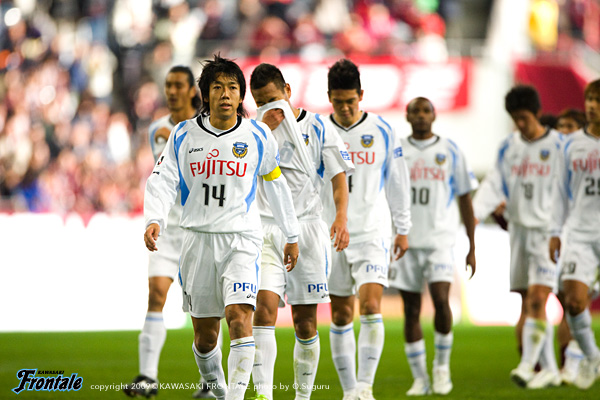 67分、山岸に代えて森を投入。68分、その森が右サイドをドリブル突破。クロスからゴール前でチャンスを作るが、惜しくもラストパスはつながらず。70分、フロンターレがセットプレーからチャンスを作るが、決められず逆に神戸にカウンターを浴びる。一気にゴール前までボールを運ばれるが、ラストパスを寺田が触り何とかしのぐ。72分、フロンターレの攻撃。右サイド森のドリブル突破からボールを受けたヴィトールがスルーパス。ここに谷口が走り込むが、わずかにタイミングが合わず。ここでヴィトールに代えて田坂がピッチへ。チャンスは作るものの、いまいちリズムに乗り切れない。76分、中村が右サイドへ展開。田坂がドリブルからクロスを入れ、ファーサイドでジュニーニョが足を出すが、シュートはゴール左に外れる。78分には、左サイドをジュニーニョがドリブル突破。クロスに谷口がヘッド合わせるが、このシュートも枠をとらえきれず。神戸は80分を過ぎたあたりから、時間を使いながらカウンター狙いに徹してくる。フロンターレは攻撃が最後までつながらない焦れた展開が続く。ロスタイム、川島のロングキックをテセが落とし、こぼれ球を谷口がダイレクトで狙うがシュートはゴール上に外れる。逆にセットプレーから神戸に決定的なカウンターを浴びるが、吉田のシュートはGK川島が足でセーブ。フロンターレの攻撃、前線でテセが粘ってスルーパス。スペースに抜けたジュニーニョのクロスに田坂が飛び込むが、わずかに田坂の頭には届かず。再び神戸にカウンターを浴びるが、拙攻に助けられる。結局、試合は1-2のままタイムアップ。