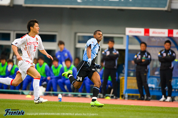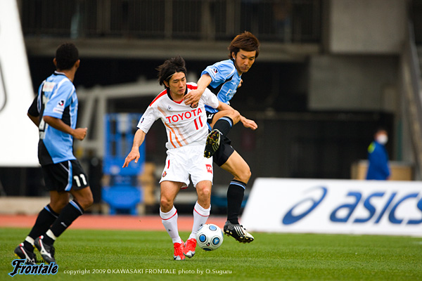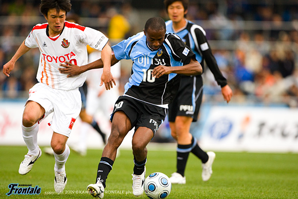 フロンターレのスターティングメンバーは、ジュニーニョとテセの2トップ、中盤右に今季初先発の田坂、左にヴィトール、中村と谷口のダブルボランチ、村上-伊藤-寺田-森の最終ライン、GK川島。立ち上がりから動きの多い展開が続く。4分、名古屋の攻撃。カウンターから左サイドに流れたダヴィがシュート。しかし、ここは寺田がブロック。中村が戻ってクリア。さらに6分にも名古屋がカウンターをかける。自陣からマギヌンが右サイド裏のスペースへロングボール。中村直のクロスを玉田にヘッドで合わされるが、シュートはGK川島の正面。ことなきを得る。7分、フロンターレの攻撃。ヴィトールがボールカットから左サイドをドリブル。ボールを受けたジュニーニョが左サイドからミドルシュートを放つが、これはサイドネット外側。8分、名古屋の攻撃。サイドのスペースにボールを出されるが、村上が体を張ってダヴィの突破を止める。9分、フロンターレの攻撃。ルーズボールを拾って中村からジュニーニョ。ラストパスを受けたヴィトールがミドルシュートを放つが、GK楢崎に阻まれる。その後は中盤での主導権争いが続く。17分、フロンターレの攻撃。中盤で田坂がボールカット。テセがドリブルをしかけて右にはたき田坂が折り返しのボールを狙うが、ゴール前のジュニーニョには合わず。20分、名古屋の攻撃。カウンターから前線のスペースにパスが出るが、走り込んできたダヴィを寺田が間一髪でカバー。22分、フロンターレの攻撃。田坂からのロングパスを受けたジュニーニョがドリブルで持ち込むが、左足でのシュートはブロックされる。迎えた22分、試合が動く。名古屋の攻撃。左サイドで小川を森を交わして速いクロス。ゴール前に走り込んできたマギヌンに体で押し込まれ、先制点を許してしまう。(0-1) しかし、フロンターレもすぐさま反撃。24分、中村とのコンビネーションから森が強引にドリブル突破。グラウンダーのマイナスの折り返しをヴィトールがうまく合わせ、名古屋の得点と同じようなパターンで同点に追いつく。(1-1)