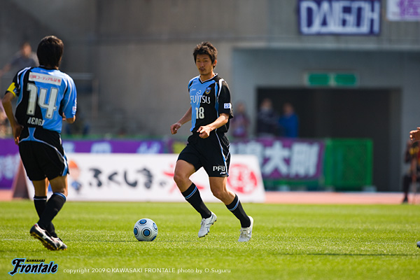 その後は試合が落ち着き、小康状態が続く。26分、京都にカウンターを狙われるが、ここは落ち着いて相手の攻撃を遅らせる。28分にはサイド攻撃からゴール前にスルーパスを入れられるが、GK川島が素早く飛び出しキャッチ。直後にフロンターレがカウンターへ。田坂のロングフィードにジュニーニョが走り込むが、ここは相手GKに飛び出されシュートに持ち込めず。京都のコンパクトなブロックの裏を狙う、ノーリスクの戦い方で試合を進めるフロンターレ。32分、GK川島のロングキックに矢島が走り込むが、わずかに届かずGKがキャッチ。33分にはヴィトールの左コーナーキックに谷口が合わせるが、このヘディングシュートはゴール上に外れる。さらに35分、中盤でボールを奪い返してカウンターへ。中村の裏への浮かし球にジュニーニョが走り込み、左サイドからクロスを入れるが、このボールはゴール前の選手に合わず。39分、京都の攻撃。最終ラインのパスミスからゴール前にボールを入れられるが、危険な場面で寺田がカバー。ピンチをしのぐ。40分、フロンターレの攻撃。ジュニーニョがドリブルをしかけてスルーパス。矢島が抜けるが、このプレーは惜しくもオフサイドの判定。42分には、菊地のロングフィードに矢島が走り込むが、わずかに届かずGKがキャッチ。フロンターレはボールを回しながら、京都の最終ラインの裏のスペースを狙う攻撃を徹底。先制点を奪ったあとは相手にリズムを作らせず試合を進め、前半を1-0のリードで折り返した。