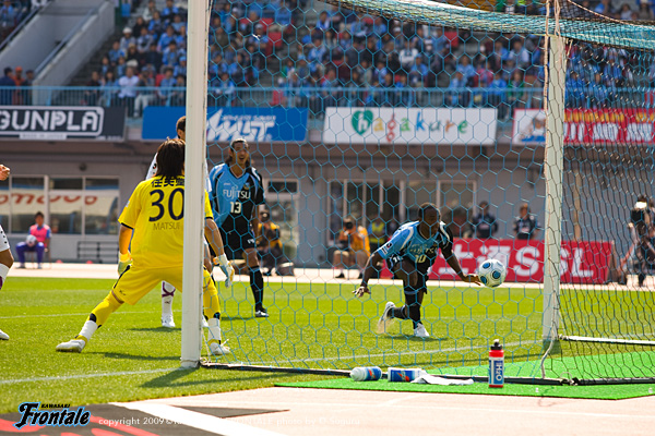 ハーフタイムのロッカールーム。「1人ひとりが集中して、責任を持って最後までプレーしていけ!」と関塚監督。「緩めるな!しっかり集中して最後までやろう」と村上。「集中して、最後までみんなでやっていこう!」と中村も声をかける。後半、ブロックを崩さずにカウンターを狙ってくる京都。フロンターレも必要以上に前に出ず、中盤で落ち着かない展開が続く。55分、京都の攻撃をゴール前でしのぎ、前線の矢島が粘って反撃へ。ボールをつないで最後はジュニーニョが左サイドから強引にシュートを狙うが、GKにキャッチされる。さらに58分、中盤でパスをつなぎ、ケンゴが決定的なスルーパス。田坂が裏のスペースに抜けるが、わずかにタイミングが合わずにシュートを打てず。61分、左サイドの村上が大きくサイドチェンジ。右サイドの田坂のマイナスのボールに走り込んだ井川が右サイドからシュート性のボールを入れるが、このボールは誰も触れずゴール左に外れる。迎えた63分、京都の攻撃をしのいでカウンターへ。左サイドのヴィトールがスルーパス。ここに走り込んだジュニーニョが左サイド深い位置から折り返し、ゴール前に走り込んだ矢島がゴール。きれいなカウンターが決まり、フロンターレが追加点を挙げる。(2-0) さらに攻勢をかけるフロンターレ。65分、ジュニーニョからパスを受けたヴィトールがDFをかわして左サイドからクロス。ファーサイドの田坂がダイレクトで右足を振り抜くが、このシュートは惜しくもDFにブロックされる。69分、足のつった矢島に代えて黒津がピッチへ。70分、京都の攻撃。右サイドから裏のスペースへボールを入れられ、ここに走り込んだ林にシュートを打たれるが、GK川島が落ち着いてセーブ。