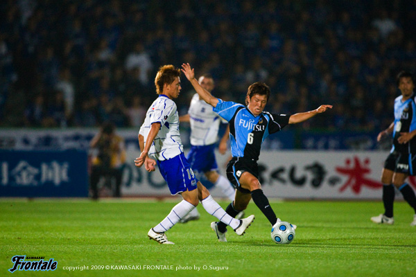 フロンターレのスターティングメンバーは、ジュニーニョとレナチーニョの2トップ、中盤右2列目に中村、左に養父、寺田と谷口のダブルボランチ、村上-伊藤-菊地-森の最終ライン、GK川島。立ち上がり1分、フロンターレの攻撃。中村がフリーキックを右に流し、中央から走り込んできた養父がミドルシュート。しかし、これはDFに当たり大きく上に外れる。2分、中村の右コーナーキックを菊地が戻し、ルーズボールを拾った中村が再びクロスを入れるがDFにブロックされる。さらに5分、伊藤からのロングフィードにレナチーニョが反応。裏のスペースに抜け出しダイレクトで狙うが、ミドルシュートはうまくミートせずゴール左に外れる。7分、G大阪の攻撃。ダイレクトでパスをつながれ、裏のスペースに抜けてきた橋本に右サイドからシュートを打たれDFに当たってコース変わるが、このボールはゴール左に外れてことなきを得る。どちらも速い展開からワンチャンスを狙う展開。主導権争いが続くが、じょじょにG大阪がボールを回しながらチャンスを作りはじめる。16分、G大阪の攻撃。フロンターレ陣内でボールを奪い返され、パスをつないで最後は遠藤に狙われるが、左足のミドルシュートは枠を外れる。17分、フロンターレの攻撃。リスタートの流れから左サイドに流れたジュニーニョがクロス。ゴール前に谷口が飛び込んでくるが、ヘディングシュートは枠をとらえきれず。決定機自体は少ないものの、中盤でのアグレッシブな攻防が続く。20分、G大阪の攻撃。レアンドロに裏のスペースへ抜け出されるが、森がついてカバー。さらにコーナーキックからゴール前で混戦となるが、ディフェンス陣がしのぐ。G大阪遠藤が3列目から試合をコントロールしはじめる。23分、G大阪の攻撃。自陣で奪い返されレアンドロにボールをもたれるが、左サイドからの折り返しを谷口がブロック。さらに24分、リスタートから左サイドを崩され、最後はレアンドロにシュートを打たれるが、これはG大阪の選手に当たりゴール左に外れる。