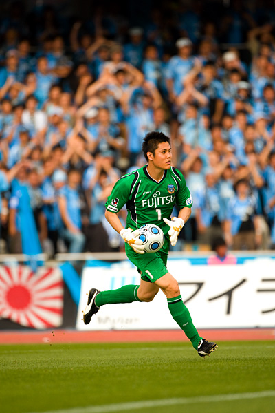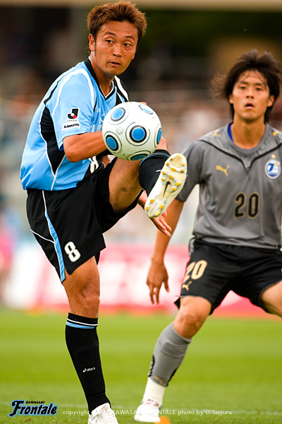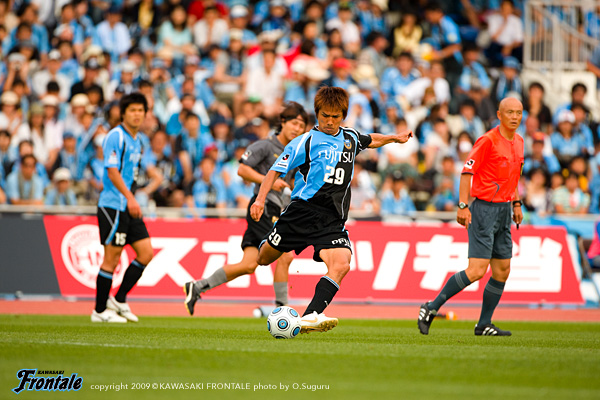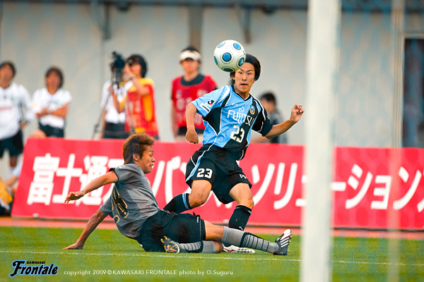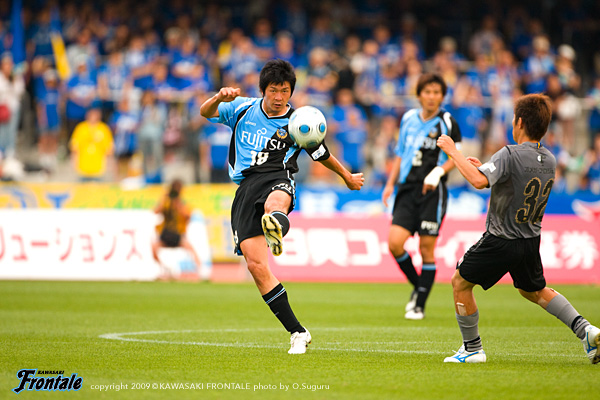 フロンターレのスターティングメンバーは、矢島のワントップ、2列目は右にレナチーニョ、中央に養父、左に山岸。谷口と横山のダブルボランチ、村上-伊藤-井川-森の最終ライン、GK川島。立ち上がりから積極的に攻撃をしかけてくる大分。速いテンポからサイドのスペースを突き、フロンターレ陣内へと押し込んでくる。だが、ディフェンス陣が落ち着いた対応で相手の攻撃をかわしていく。8分、大分の攻撃。GKからのロングボールのこぼれ球に走り込んだウェズレイに右サイドからシュートを打たれるが、これは枠をとらえきれず。11分、フロンターレの攻撃。早いリスタートから前線のスペースに山岸が走り込むが、DFに挟まれシュートに持ち込めず。12分、大分の決定機。ロングボールのセカンドボールを拾われ、スルーパスに反応した鈴木に決定的なシュートを打たれるが、GK川島のワンハンドセーブで大ピンチをしのぐ。このビッグプレーからフロンターレがペースをつかみはじめる。14分、GK川島のロングボールに矢島が競り勝ち、そのまま突破を狙うがDFに止められる。15分には、養父→矢島→山岸とテンポよくボールがつながり、最後はレナチーニョが狙うが、シュートはDFに当たりラインを割る。16分、コーナーキックから養父の戻したボールを村上が左サイドからミドルシュートを狙うが、惜しくもゴール右に外れる。