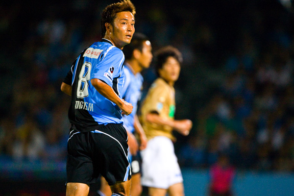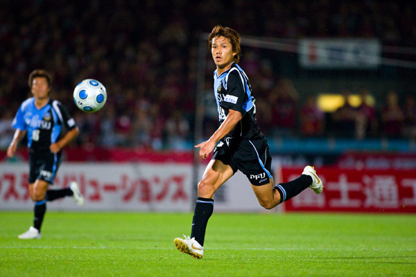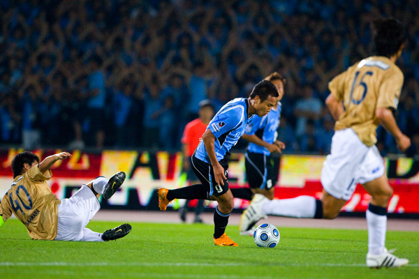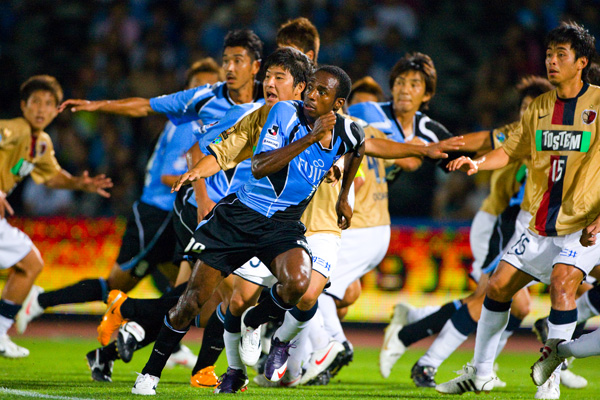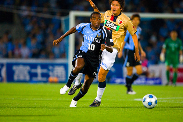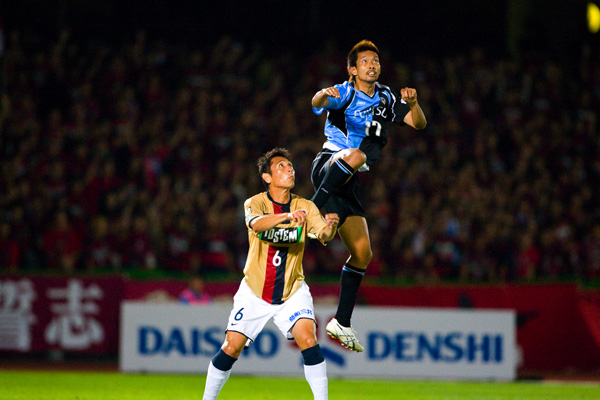 フロンターレのスターティングメンバーはジュニーニョとテセの2トップ、中盤右に中村、左に山岸、寺田と谷口のダブルボランチ、村上-伊藤-菊地-森の最終ライン、GK川島。立ち上がり1分、フロンターレの攻撃。ジュニーニョからボールを受けた中村が右サイドからクロス。テセが落としてジュニーニョが左足を振り抜くが、このシュートはGKにキャッチされる。タテに速い攻撃をしかけてくる鹿島。マルキーニョスを菊地がマーク。序盤から速い展開が続く。6分、鹿島の攻撃。自陣からダイレクトでタテにつながれ右サイドからクロスを入れられるが、GK川島が飛び出しセーブ。7分、フロンターレの攻撃。相手陣内で中村がボール奪取。そのまま右サイドからドリブルをしかけて折り返し入れるが、ゴール前を固められてフィニッシュにはつなげず。10分、セットプレーの流れからパスをつなぎ、最後は左サイドから中村がシュート性のクロス入れるが、このボールはゴール上に外れる。前に圧力をかけてくる鹿島。ボールを奪ってカウンターをかけたいが、プレッシャーがきつくつなぐことができない。13分、鹿島のセットプレーをしのいで反撃。中村のロングボールにジュニーニョが走り込むが、GKに飛び出されてマイボールにできず。15分には左サイドからのショートコーナーから中村がクロス。ゴール前の混戦にジュニーニョとテセが詰めるが、ボールはGKにキャッチされる。18分、森が右サイドをドリブル突破をかけてクロス。しかし、クリアボールから逆にカウンターを浴びるが、シュートは枠を外れる。鹿島にセカンドボールを拾われて押し込まれる展開が続く。22分、鹿島の攻撃。マルキーニョスが意表を突いてロングシュートを狙うが、GK川島がキャッチ。