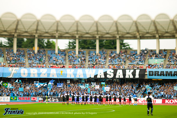 第18節、リーグ神戸戦。水曜日のナビスコカップ第1戦・鹿島戦は0-1で惜敗。リーグ戦もホーム鹿島戦、アウェイ新潟戦と引き分けが続いている。シーズン後半戦の初戦となるこのホームゲームで勝利し、中断明けのいい流れを取り戻したい。無風で異常に蒸し暑く、タフなゲームを予感させる等々力陸上競技場。18:03キックオフ。