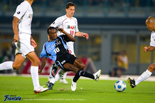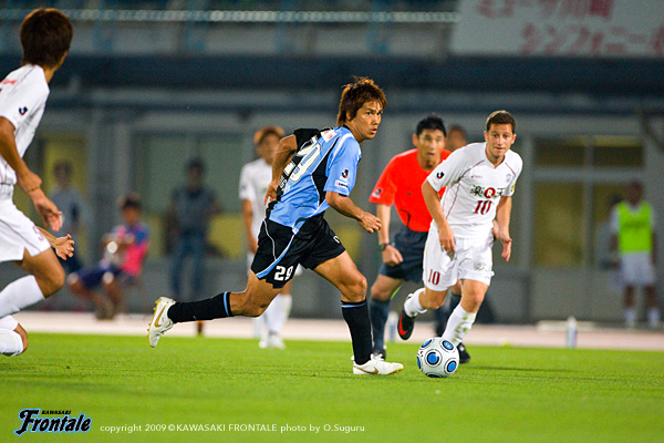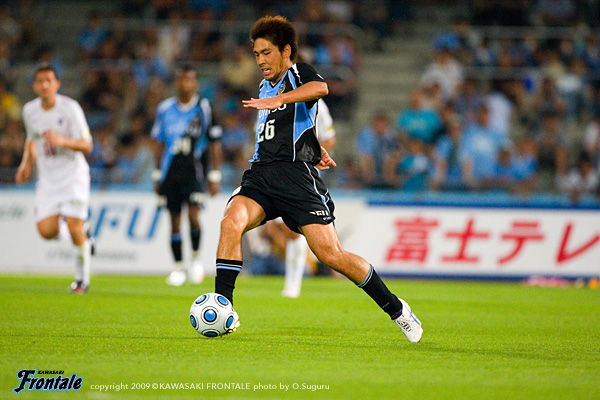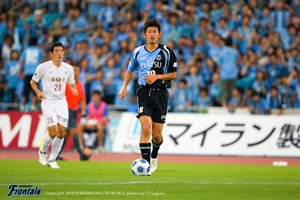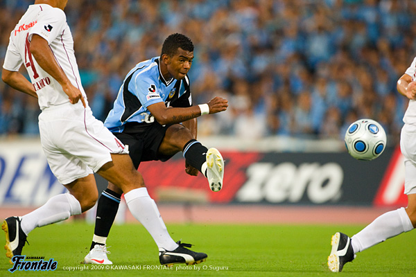 フロンターレのスターティングメンバーは、テセが最前線に張り、右にレナチーニョ、左にジュニーニョ、1.5列目に中村。谷口と横山のダブルボランチ、村上-伊藤-菊地-久木野の最終ライン、GK川島。3分、神戸の攻撃。3連続でコーナーキックとなるが、ディフェンス陣がゴール前でクリア。5分、フロンターレの攻撃。中村の中央からのフリーキックを左に流れたテセがヘッドで合わせるが、このシュートはうまくミートせず。さらに6分、リスタートの流れから前に圧力をかけるが、テセのミドルシュートはDFにブロックされる。8分、自陣で久木野がサイドチェンジ。ボールを受けたジュニーニョが左サイドをドリブル。アーリークロスを入れるが、DFに触られラインを割る。9分、中村のコーナーキックのクリアボールに村上が反応。ミドルシュートを狙うがゴール上に外れる。10分、伊藤がタテに入れたボールを中村が受けてスルーパス。トラップしたテセが左足でシュートを狙うが、DFに当たりGKがキャッチ。11分、谷口とのコンビネーションからレナチーニョが右サイドをドリブル。しかしDFに止められ、ロングボールから神戸がカウンター。茂木が走り込むがGK川島が飛び出しキャッチ。12分、フロンターレも反撃。レナチーニョがドリブル。左サイドに回りながら左足でミドルシュートを狙うが、惜しくもGKにセーブされる。暑さのせいか、やや重苦しい展開が続く。20分、スローインからボールをつないで、こぼれ球を拾ったジュニーニョが折り返しを狙うがゴール前には合わず。さらにセカンドボールを拾い、レナチーニョが左サイドからフェイントをかけてDFをかわしクロス。ゴール前のテセがヘッドですらせるが、わずかにタイミングが合わず。