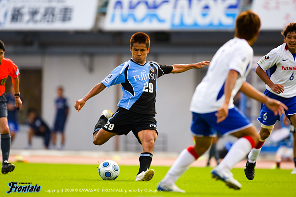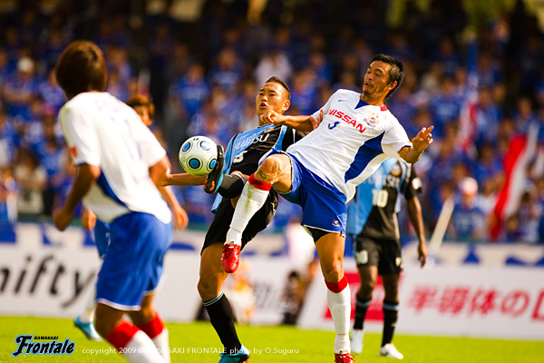 21分、横浜FMの攻撃。インターセプトから反撃をかけられ右サイドからゴールに前クロスが入り、GK川島の前をボールが通過するが、ゴール前で森がクリア。危ない場面だった。その後はやや落ち着いた展開になるが、横浜FMにボールを持たれる時間が多くなってくる。28分、フロンターレの攻撃。横浜FMの攻勢をしのいでレナチーニョが自陣からドリブル。中盤も抜けるがDFにファールで止められる。さらに29分、左サイドのジュニーニョがドリブルからクロス。テセが粘って戻し、谷口がミドルシュート。DFに当たってコースが変わるが、惜しくもポストに当たって外れる。30分、31分とボールをつないで右サイドの森から攻撃をかけるが、ゴール前ではね返される。34分、カウンターから中村が倒されながらもラストパス。ジュニーニョが抜け出すが、DFに囲まれフィニッシュに持ち込めず。36分、横浜FMの攻撃。左サイドから崩しをかけられスルーパスに渡邉が抜け出してくるが、GK川島が飛び出し体でシュートを止める。38分、フロンターレの攻撃。横浜FMの攻勢をしのいでカウンターへ。ジュニーニョがラストパスを狙うが、タイミングが合わず。39分、横浜FMの攻撃。セカンドボールを拾われ右サイドの田中がドリブルでペナルティーエリア内に侵入。ゴール前に決定的な折り返しが入るが、GK川島が飛び出し渡邉のシュートをブロック。43分にもサイドチェンジから左サイドの小宮山がペナルティーエリアに入り込み、こぼれ球を狩野に拾われるが、ここもGK川島がシュートセーブ。44分、フロンターレの攻撃。谷口のスルーパスを受けたレナチーニョが右サイドから折り返し。ジュニーニョ、谷口とゴール前に飛び込むが、惜しくもフィニッシュに持ち込めず。暑さの残るデーゲームのピッチ。連戦のフロンターレの選手にはこたえる状況だが、我慢しながら決定機を作り出している。最後まで集中力を切らさずに戦い抜けるか。0-0で前半を折り返した。
