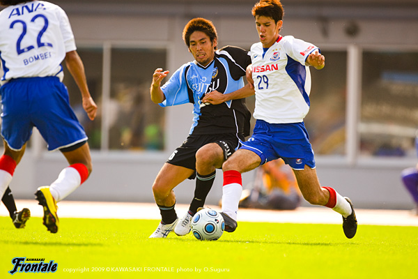 ハーフタイムのロッカールーム。「サポーターと一緒に等々力一体となっていくぞ!残り45分、粘り強く戦っていこう!」と関塚監督。「時間帯でプレーをはっきりさせよう。しっかり落ち着いて作り直していこう!」と川島も声をかける。47分、横浜FMの攻撃。ロングボールに坂田が抜け出し、中央の狩野から右サイドへ展開。田中の折り返しを受けた狩野にシュートを打たれるが、このボールはゴール上に外れことなきを得る。49分、フロンターレの攻撃。左サイドの中村のアーリークロスをテセがヘッドで流し、レナチーニョがDFに挟まれながらシュートに持ち込むが、これは惜しくもポスト直撃。50分には横浜FMのカウンターをしのいで反撃。早いリスタートからジュニーニョが抜け出すが、うまくミートできずシュートは枠を外れる。51分、横浜FMの攻撃。細かくパスをつながれ押し込まれ狩野にシュートを打たれるが、DF陣がブロック。こぼれ球に松田が詰めてくるが、GK川島がシュートキャッチ。52分、フロンターレの攻撃。右サイドの森がスペースに抜け出しクロスを入れるが、ゴール前に飛び込んできたテセはGKと交錯。ファールの判定。54分、横浜FMの攻撃。右サイドの坂田に抜け出され、セカンドボールも拾われ押し込まれるが、ゴール前を固めてしのぐ。56分、コーナーキックのセカンドボールを拾い、レナチーニョからパスを受けたジュニーニョが左サイドからクロス。テセがヘッドで合わせるが、惜しくもGKにキャッチされる。さらに57分、右サイドから森がドリブル。ジュニーニョとのコンビプレーからペナルティーエリアに入り込み、森の折り返しをテセがシュート。しかし、ここは惜しくもブロックされる。58分にも、スローインからゴール前で混戦となるがシュートに持ち込めず。60分、横浜FMの攻撃。狩野にドリブルを許し左サイドからペナルティーエリアに入り込まれるが、左足のシュートをGK川島がセーブ。さらに61分、長谷川にミドルシュートを打たれ、こぼれ球がゴール前に転がってくるが、菊地と川島で挟み込みケア。