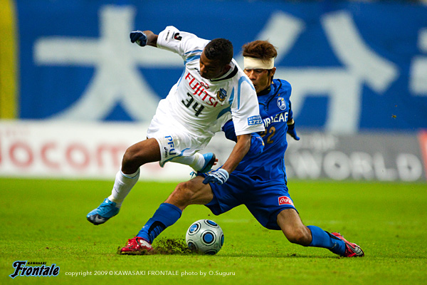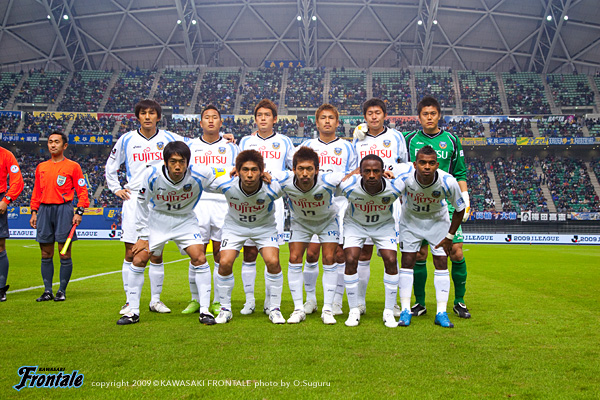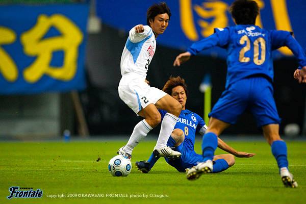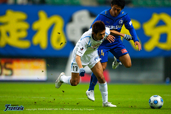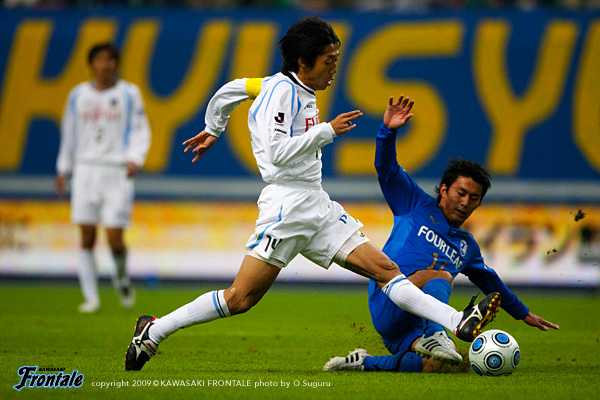 フロンターレのスターティングメンバーは、ジュニーニョとテセの2トップ、中盤右にレナチーニョ、左に中村。谷口、横山のダブルボランチ。村上-伊藤-菊地-井川の最終ライン。GK川島。通常とは逆のエンドからスタート。立ち上がり数十秒、大分の攻撃。いきなりスルーパスを通され左サイドの清武から折り返し。フェルナンジーニョにゴール前に飛び込まれるが、GK川島が飛び出しはじく。危ない場面だった。さらに4分、左サイドの高橋のタテパスがDFに当たって裏にこぼれるが、GK川島が飛び出しキャッチ。立ち上がりから勢いのある攻撃をかけてくる大分。ボールへのアプローチも速い。11分、カウンターからゴール前に迫られ右サイドからのマイナスのボールに走り込んできた金崎にシュートを打たれるが、ここは井川がブロック。さらにセカンドボールをつながれ、スルーパスに飛び込んできた高橋にシュートを打たれるが、このボールはゴール左に外れてことなきを得る。12分、フロンターレの攻撃。レナチーニョの左コーナーキックをニアサイドで谷口がすらし、ファーサイドに流れたボールをジュニーニョがヘッドでゴール前へ。テセが飛び込むが惜しくもGKにセーブされ、さらにセカンドボールを拾ってジュニがクロスを入れるが、このボールはGKにキャッチされる。14分、大分の攻撃。右サイドから崩しをかけられ、クロスをファーサイドで金崎が戻し、ゴール前の清武にバイシクルシュートを狙われるが空振り。危ない場面だった。17分、フロンターレの攻撃。コーナーキックのクリアボールを拾い中村がスルーパスを狙うが、ボールを受けた伊藤はオフサイド。攻守の切り替えが速い大分。23分、左サイドの村上が浮かし球を前線のスペースへ。レナチーニョが追いついて折り返しを狙うが、このボールはつながらず。24分、横山のサイドチェンジから左サイドのジュニーニョが谷口とのコンビネーションから突破を狙うが、惜しくもラストパスに持ち込めず。