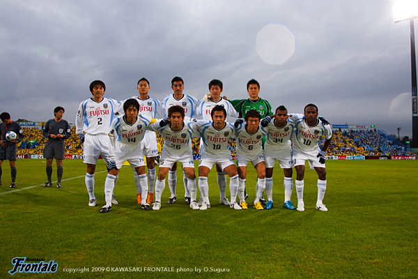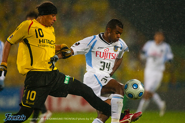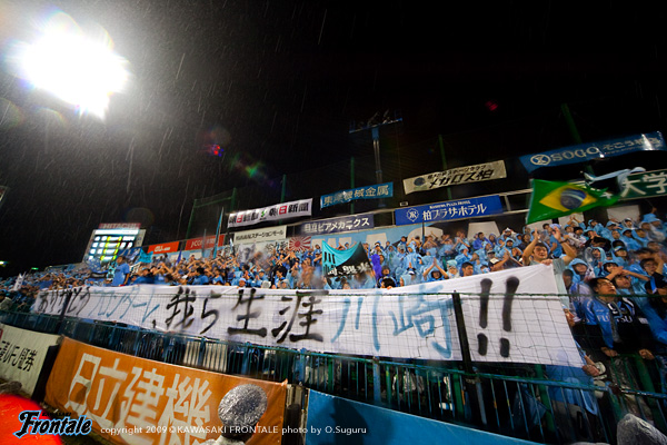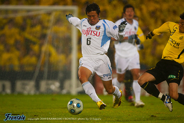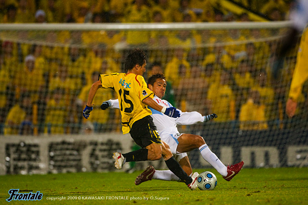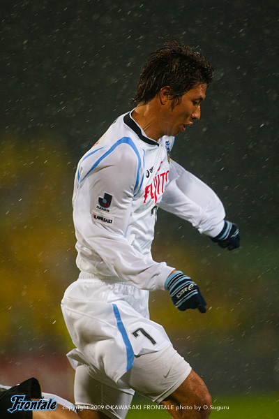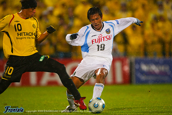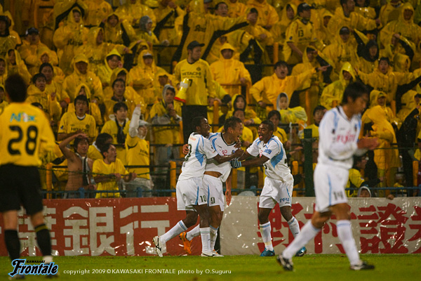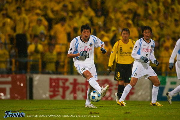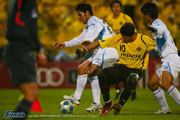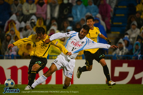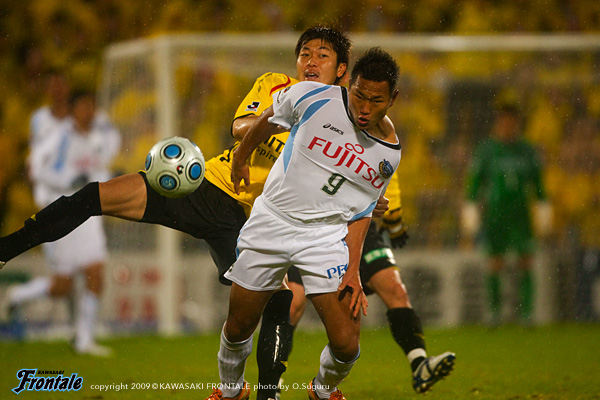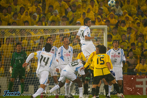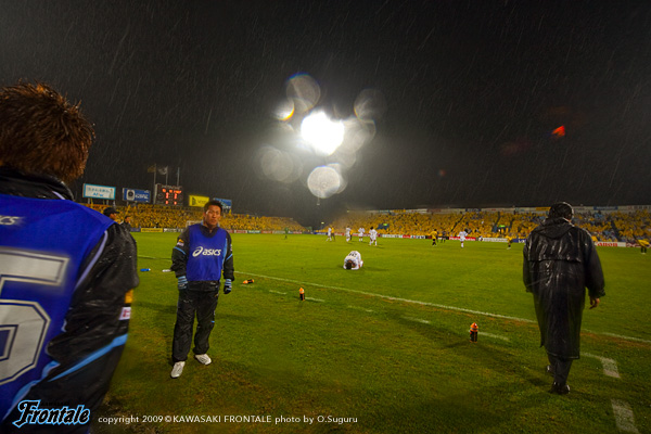フロンターレのスターティングメンバーは、最前線にテセ、右にレナチーニョ、左にジュニーニョ。中盤右に田坂、左に中村、底に横山。村上-伊藤-寺田-森の最終ライン。GK川島。立ち上がりはお互いに相手の様子をうかがう展開。5分、フロンターレの攻撃。パスカットからカウンターへ。左サイドのジュニーニョからボールを受けたレナチーニョがドリブル突破。右サイドから折り返しを入れるが、ゴール前のジュニーニョには惜しくもタイミングが合わず。さらに7分、村上のロングフィードからテセがポストプレー。ボールを受けたレナチーニョがミドルシュート。ブロックされてこぼれたボールに反応したジュニーニョが左サイドから折り返し。ゴール前に田坂が飛び込むがDFにカバーされる。12分、柏の攻撃。縦パスがフリーの澤に渡り、中央のフランサを経由して右サイドの杉山がシュート。しかし、ここは伊藤がスライディングでブロック。13分、フロンターレの攻撃。中盤からパスをつないで横山から右サイドへ展開。レナチーニョがクロスを入れるが、ゴール前のテセにはタイミングが合わず。14分、柏の攻撃。攻撃をかけたところで逆にカウンターを浴び、右サイドのフランサがラストパスを前線へ。澤が飛び込んでくるが、寺田がしぶとくカバーに入る。さらに16分、左サイド橋本にドリブル突破を許しクロスがゴール前に入るが、ゴール前には合わずことなきを得る。このあたりから雨風が強くなってくる。18分、柏の攻撃。パスをつながれ左サイドからクロスを入れられ、澤が戻したボールをフランサがシュート。しかし、このボールはGK川島がファインセーブ。さらに22分、左サイドから崩しをかけられ、クロスにフランサが飛び込んでくるが村上がヘッドでクリア。24分、フロンターレの攻撃。中盤でのボールカットからカウンターへ。右サイドの森が折り返しを入れるが、ゴール前でクリアされる。