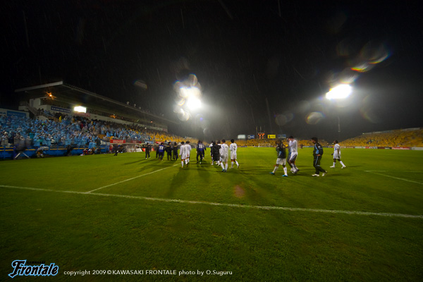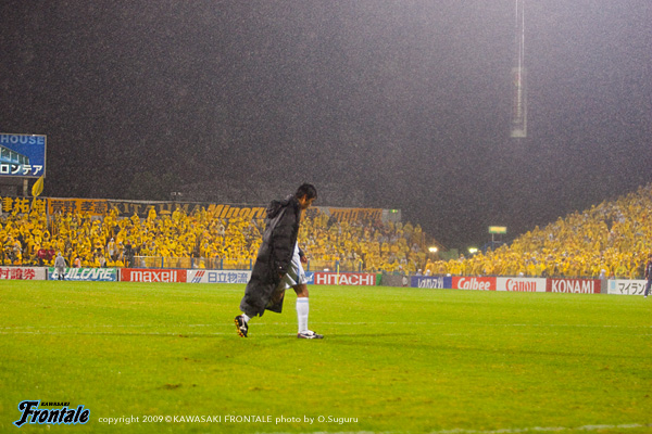 64分、柏の攻撃。右サイドからのフリーキックを澤に落とされ、菅沼にシュートを打たれるが枠を外れる。さらに65分、栗澤の右コーナーキックをパクにヘッドで合わされるが、シュートはゴール上に外れる。66分には、杉山に意表を突いたミドルシュートを打たれるが、GK川島ががっちりキャッチ。さらに左サイドから崩しをかけられ折り返し。菅沼に合わされるが、このシュートもGK川島がキャッチ。リスクをかけて前に圧力をかけてくる柏。迎えた68分、藏川にペナルティーエリアに入り込まれてPKを献上。70分、このPKをフランサに決められ1点を返される。(3-1) 72分、レナチーニョに代えて谷口がピッチに入りボランチへ。田坂が右、中村が左の4-4-2にシフト。74分、フロンターレの攻撃。右サイドの森がドリブルで切れ込み、戻したボールに走り込んだ谷口が左足を振り抜くが、ミドルシュートはゴール左に外れる。75分、柏の攻撃。ボールを奪われカウンターを浴び、フランサからスルーパスが入るが、GK川島が飛び出しクリア。数的不利ながら柏に押し込まれる。78分、フロンターレの攻撃。柏の攻勢をしのいでカウンターへ。テセからラストパスを受けたジュニーニョが右サイドからDFにつかまれながらシュートを放つが、惜しくもゴール左に外れる。迎えた79分、パスをつながれ左サイドを抜け出した菅沼から折り返し。飛び込んできたフランサにシュートを決められ、1点差に追いすがられる。(3-2) 80分、フロンターレの攻撃。柏の攻撃をしのいで反撃。ジュニーニョが右サイドをドリブル。折り返しにテセが飛び込むが惜しくもタイミングが合わず。81分、横山に代わり菊地が最終ライン入り、寺田がボランチへ。ここからさらに雨足が激しくなる。柏の捨て身の攻撃に押し込まれる時間帯が続くが、84分、テセにタックルをかけた杉山が2枚目のイエローカードを受けて退場処分に。柏は9人となる。85分、テセに代えて黒津がピッチへ。柏の猛反撃をしのぎ、3-2でタイムアップ。