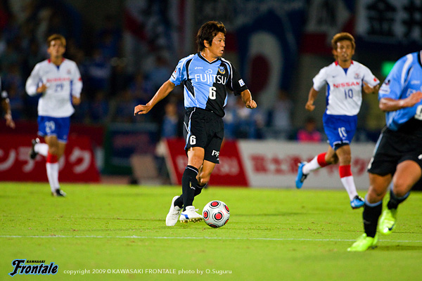 21分にも、テセが粘り森が相手に囲まれながらラストパス。ジュニーニョがドリブルから左足を振り抜くが、このミドルシュートはゴール左に外れる。ここでアクシデント。24分、菊地が負傷してピッチ外へ。横浜FMの攻撃。右サイドからのフリーキックからゴール前で混戦。こぼれ球を渡邉に狙われるが、このシュートは枠を外れことなきを得る。25分、フロンターレの攻撃。前線3人でパスをつないで左サイドに流れたジュニーニョがアーリークロスを入れるが、惜しくもGKにキャッチされる。26分、ここで負傷の菊地に代わって井川がピッチへ。セットプレーから押し込まれるが、ゴール前でしのぐ。29分、横浜FMの攻撃。ロングボールから裏に田中が抜け出し、右サイドからシュート。しかし、杉山が好セーブ。31分にも速いテンポでつながれ、左サイドから兵藤に強烈なミドルシュートを打たれるが、ここも杉山が好セーブ。連続してピンチをしのぐ。34分、フロンターレの攻撃。伊藤の縦パスをレナチーニョがダイレクトで戻し、走り込んできた養父がダイレクトでミドルシュートを狙うが枠には飛ばず。横浜FMに圧力をかけられ守る時間帯が長いものの、しのぎながらカウンターチャンスを狙う。36分、横浜FMの攻撃。左サイドから崩しをかけられ山瀬が抜け出すが、鋭いクロスを谷口がブロック。39分、フロンターレの攻撃。養父の裏へのロングパスに森が走り込み、右サイドからクロスを入れるが、ここは惜しくもDFにクリアされる。横浜FMにパスを回されるが、しっかりとポジションをとってブロックを作り危険なエリアに入り込ませない。43分、河合の強烈なロングシュートも杉山がセーブ。横浜FMが立ち上がりから押し気味に試合を進めるが、フロンターレがワンチャンスを確実にものにして先制。その後は落ち着いた試合運びで守備を固め、そこからカウンターを狙っていく。1-0のリードで前半を折り返した。