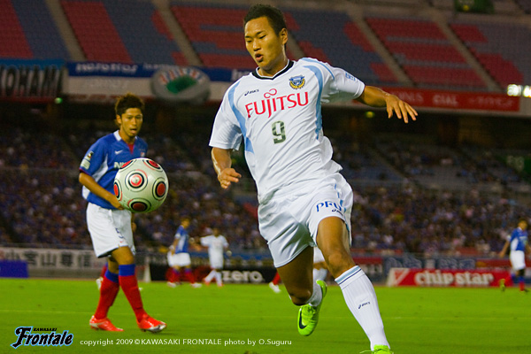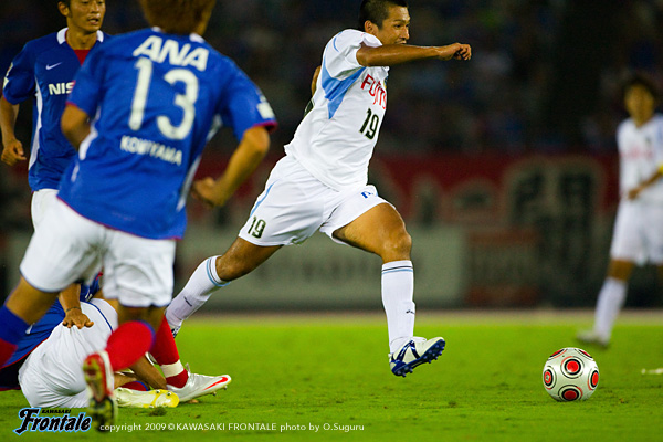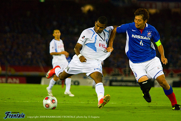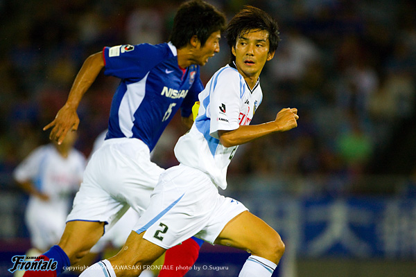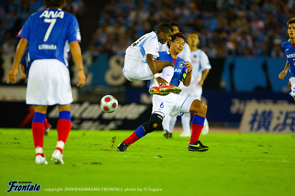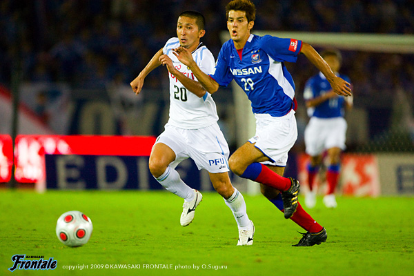 フロンターレのスターティングメンバーは、最前線にテセ、右にレナチーニョ、左にジュニーニョ、1.5列目に養父、寺田と谷口のダブルボランチ、村上-伊藤-井川-森の最終ライン、GK杉山。1分、フロンターレの攻撃。右サイドから崩しをかけて森がクロス。こぼれ球を拾った谷口が左サイドからクロスを入れるが、GKにキャッチされる。さらに4分、寺田からパスを受けた左サイドの村上がジュニーニョへ。ジュニーニョが深い位置から折り返しを入れ、ゴール前でレナチーニョがシュートを放つが、これはGK正面。直後にGKからロングボール。金が走り込むが、井川がついてカバー。5分、横浜FMの攻撃。左コーナーキックの場面で狩野からゴール前にボールが入るが、GK杉山が飛び出しパンチング。さらに6分、中盤でボールを奪われスルーパスを狙われるが、ここは井川がスライディングでカバー。立ち上がりから積極的なしかけ合いが続くが、10分を過ぎたあたりからやや落ち着いた展開に。一進一退の攻防が続く。17分、フロンターレの攻撃。左サイドでレナチーニョが粘り、ボールを受けた村上がクロスを入れるがクリアされる。19分、横浜FMの攻撃。左サイドからの折り返しを狩野が落とし、河合にミドルシュートを打たれるが枠を外れる。さらに20分、狩野のコーナーキックを栗原にヘッドで折り返されるが、GK杉山ががっちりキャッチ。序盤からサイドバックを上げて攻撃をかける横浜FM。24分、リスタートの流れから横浜FMに速攻をかけられ、左サイドからクロス。GK杉山が飛び出しはじくが、こぼれ球に走り込んできた田中がシュート。しかし、ここはレナチーニョが戻り、シュートは枠を外れる。