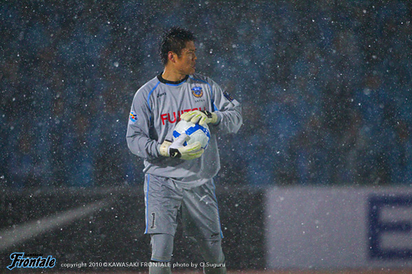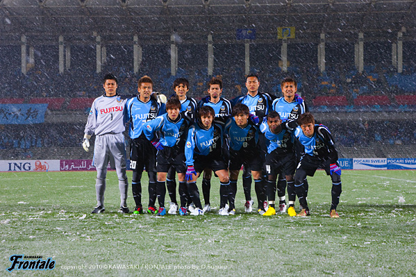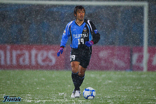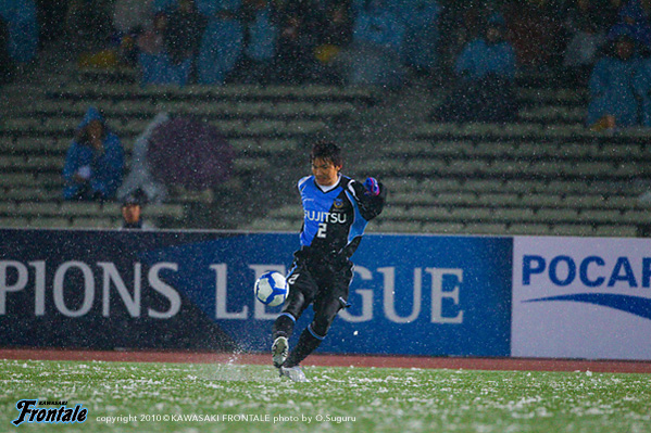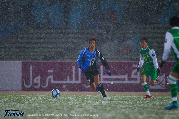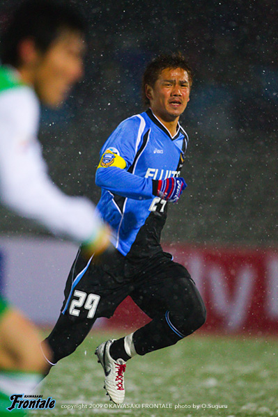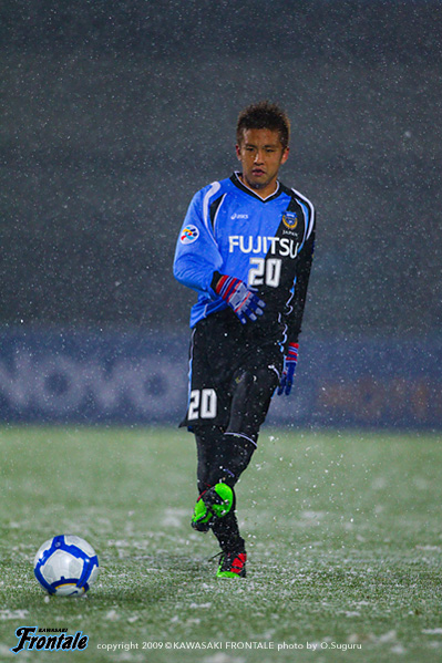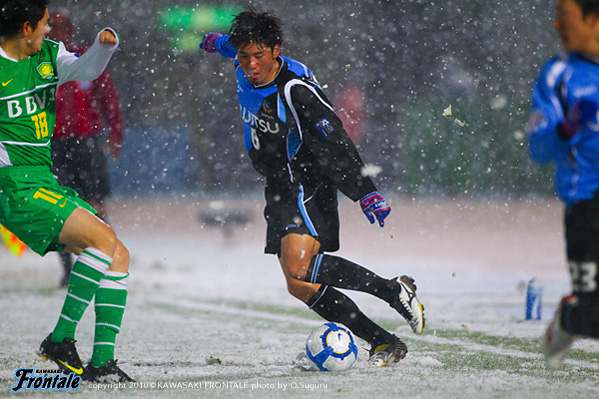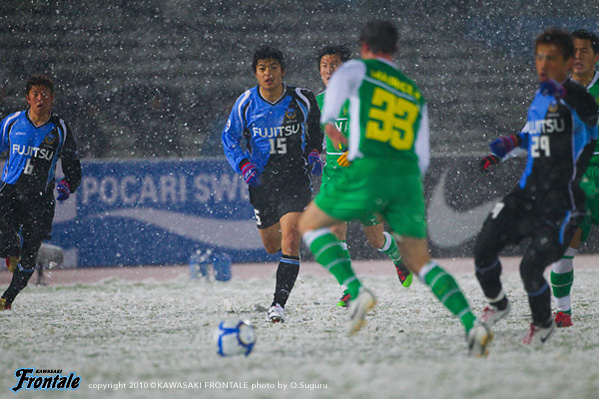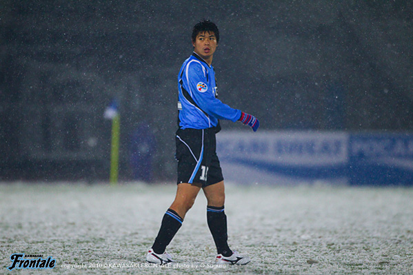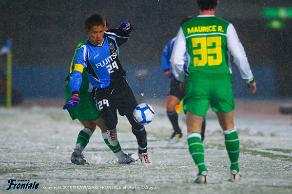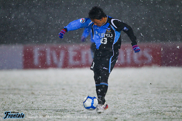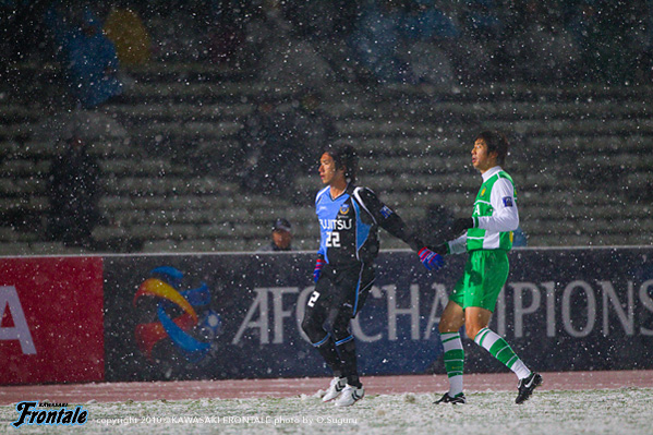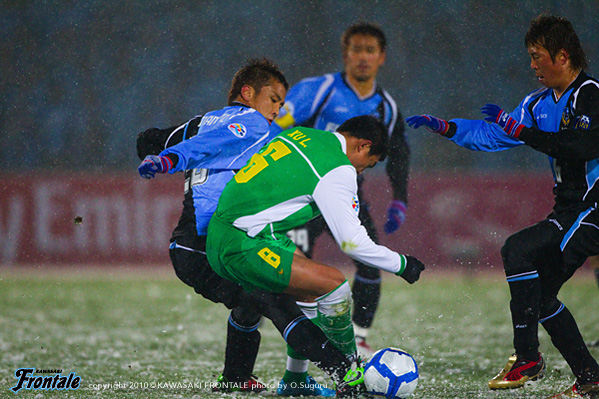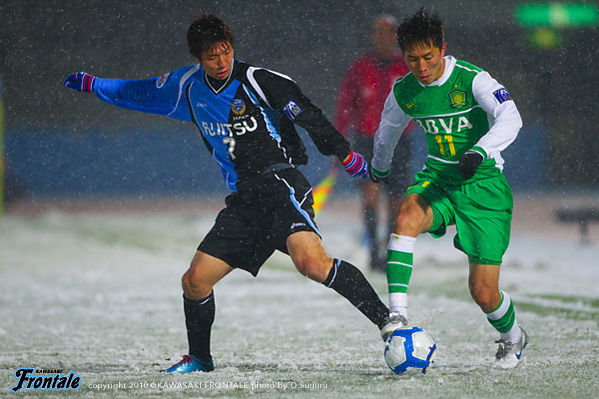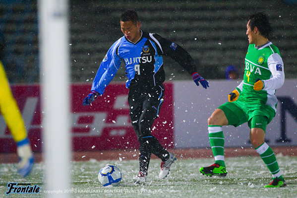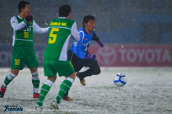 フロンターレのスターティングメンバーは、最前線にテセ、右にレナチーニョ、左に黒津。中盤は2列目に谷口と田坂、底に稲本。小宮山-伊藤-菊地-森の最終ライン。GK川島。雪のピッチに慣れていないせいか、お互いにうまくボールをコントロールできない展開が続く。6分、北京にカウンターを浴びるが、伊藤が戻ってスライディングでカバー。8分、フロンターレの攻撃。稲本のインターセプトからボールを受けた田坂のシュート性のボールが前線の黒津へ。黒津が反転して右足でシュートを放つが、これはGK正面。9分にもレナチーニョが左足でミドルシュートを狙うが、GKにキャッチされる。12分にもカウンターからレナチーニョがドリブル。パスを受けた黒津が左サイドからシュートを放つが、ここもGKにキャッチされる。14分、北京の攻撃。裏のスペースに出たボールにシュー・リャンが走り込むが、菊地が戻りながらカバーに入る。17分、フロンターレの攻撃。スローインからボールをつないで右サイドの森がマイナスのボール。ここに走り込んだ稲本が左足でミドルシュートを放つが、DFに当たって外れる。19分、菊地の裏のスペースへのロングフィードに黒津が走り込みクロスを狙うが、惜しくもDFに当たってラインを割る。
