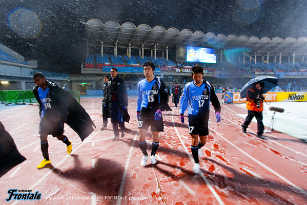 ハーフタイムのロッカールーム。「こんな天候のなかでも応援してくれるサポーターのみんながいるんだ。サポーターのためにも気持ちを入れて絶対に勝点をプレゼントするぞ!」と高畠監督。試合に駆けつけた中村も「落ち着いて自分たちのサッカーをやっていこう!」と声をかける。後半に入り雪風が強まり、ピッチコンディションはさらに厳しい状況に。ボールが収まらない上にところどころで止まってしまうために、コントロールがより難しくなってくる。50分、自陣でルーズ拾われ北京にカウンターを浴びるが、どうにかゴール前でしのぐ。53分、フロンターレの攻撃。中央からのフリーキックから森がクロス。谷口がヘッドですらすが、ゴール前にはタイミングが合わず。ボールがうまくつながらず、北京にカウンター浴びる場面が目立つ。58分、フロンターレの攻撃。田坂のスルーパスからテセが粘り、田坂が右サイドから折り返し。ゴール前で混戦となるが、惜しくもフィニッシュには届かず。59分、左サイドからのコーナーキック。田坂のキックのこぼれ球を拾い谷口が折り返しを狙うが、惜しくもラインを割る。さらに61分、田坂の右サイドからのフリーキックがGKの頭上を越えてファーサイドのレナチーニョへ。レナチーニョが落ち着いて角度のないところからシュートを狙うが、惜しくも左ポストに当たって外れる。63分、北京の攻撃。リスタートのこぼれ球を拾われ強引にシュートまで持ち込まれるが、GK川島がキャッチ。
