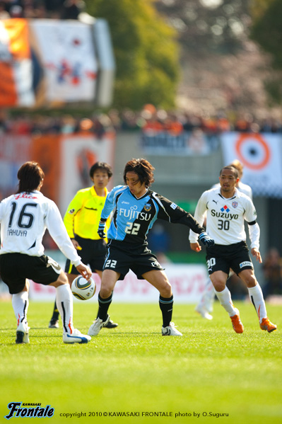 22分、フロンターレの攻撃。清水の攻勢をしのいでカウンターへ。テセからパスを受けたレナチーニョがドリブルをしかけるが、DFにファールで止められる。25分、清水の攻撃。中央でパスをつながれ小野がスルーパス。岡崎に抜け出されるがディフェンス陣がブロック。危ない場面だった。27分、中盤でボールを奪われ清水にカウンターを浴びるが、稲本が戻りカバー。28分、フロンターレの攻撃。自陣からパスをつないで左サイドの小宮山がドリブル。クロスが入るがニアサイドの黒津は惜しくもシュートに持ち込めず。30分、清水の攻撃。自陣でのパスミスを拾われ小野にドリブル突破を許すが、ディフェンス陣が体を張ってディフェンス。さらに34分、右サイドから崩しをかけられ折り返しを入れられるが、ゴール前でディフェンス陣がはね返す。36分にはカウンターを浴びペナルティーエリア内で大混戦となるが、GK川島が果敢に飛び出しディフェンス陣がどうにかクリア。大ピンチをしのぐ。40分、フロンターレの攻撃。稲本のボールカットからカウンターへ。レナチーニョのスルーパスに抜け出した森が右サイドからクロスを入れるが、惜しくもテセには合わず。43分にも森からボールを受けた田坂が右サイドからクロスを入れるがクリアされる。シンプルな攻撃をかけつつ、パスワークも混ぜてくる清水。危ない場面もあったが、ディフェンス陣がゴール前でしのいだ。フロンターレにもチャンスがあったが、なかなかフィニッシュまで持ち込むことができない。0-0で前半を折り返した。