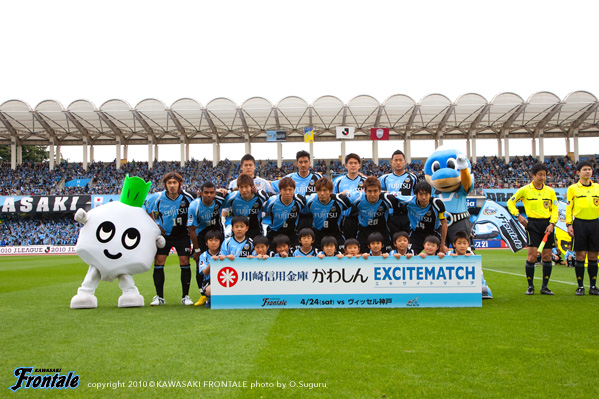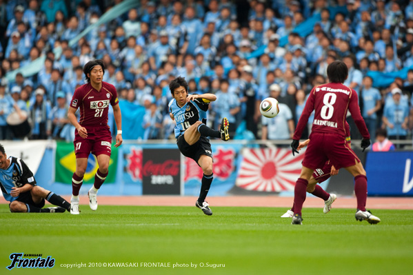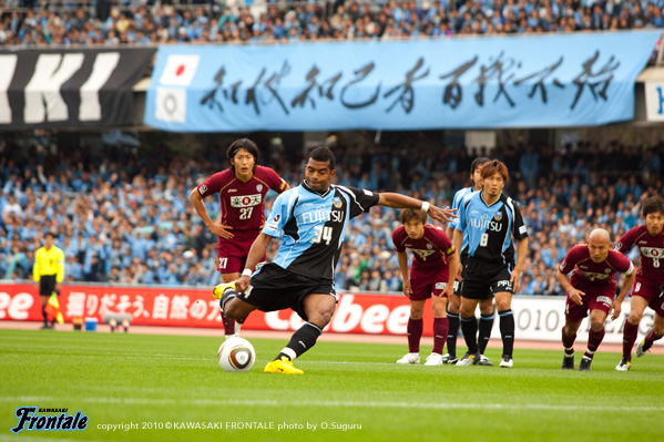 フロンターレのスターティングメンバーは最前線にテセ、左に黒津、右にレナチーニョ。中盤2列目に中村と田坂、底に稲本。小宮山-寺田-井川-森の最終ライン。GK川島。立ち上がり、フロンターレのコーナーキックのボールをクリアされ神戸にカウンターを受けるが、走り込んだ都倉には稲本がカバーに入る。2分にもロングボールで裏のスペースを狙われるが、GK川島が飛び出しクリア。さらに3分、リスタートの流れから小川にかわされるが、寺田と井川で挟み込みカバー。立ち上がりの神戸の攻勢をしのぎ迎えた4分、ロングボールをテセが競り勝ち、こぼれ球に詰めた黒津が勝負をしかけ、たまらずDFがファール。フロンターレがPKを得る。5分、このPKをレナチーニョが落ち着いてゴール左上決めて先制点を挙げる。(1-0) 7分、神戸の攻撃。速いタイミングで右サイドからアーリークロスが入るが、森が対応しGK川島がクリア。直後のプレー、中盤でレナチーニョがボールキープ。ここからダイレクトでパスがつながり、左サイドを抜け出したテセがクロスを狙うが、惜しくもDFに当たって外れる。速い攻守の切り替えからシンプルにロングボールを入れてくる神戸。10分、都倉のポストプレーからパスをつながれ、裏のスペースにポポが走り込むが、森が対応しGK川島がキャッチ。12分、フロンターレの攻撃。中盤でボールがつながり、テセの浮かし球に走り込んだレナチーニョが折り返しを入れるが、黒津にはわずかにタイミングが合わず。13分、GK川島のロングキックをテセが落とし、黒津がDFをかわして左足を振り抜くが、このミドルシュートはゴール右に外れる。お互いに裏のスペースを突く攻撃をしかけ合う展開が続く。