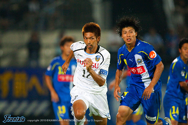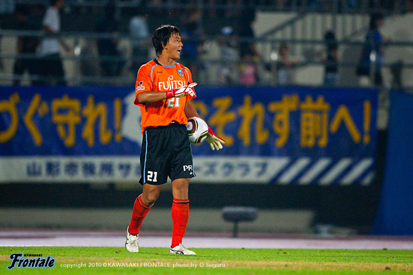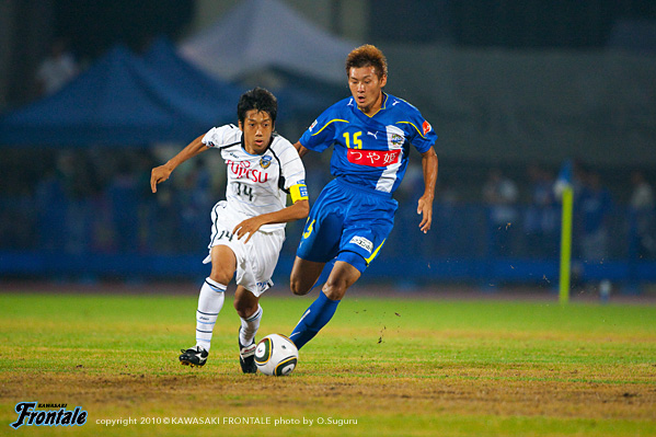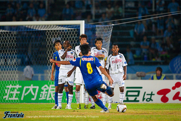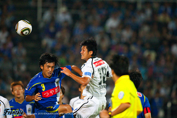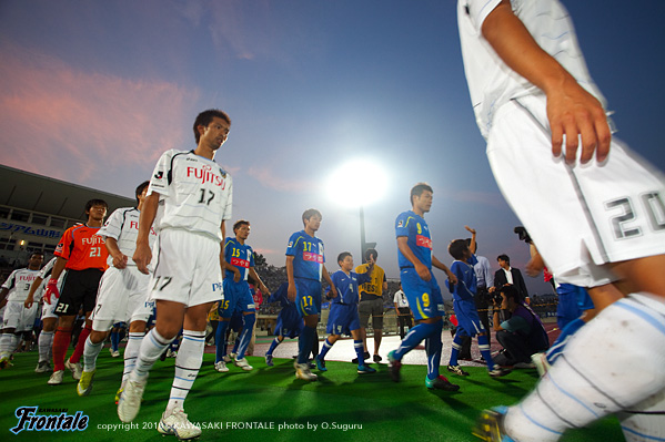 25分、フロンターレの攻撃。菊地のロングボールを黒津が頭ですらすが、走り込んできた田坂は惜しくも触れず。26分、ショートコーナーから田坂のクロスをファーサイドで菊地が落とすが、ゴール前にはつながらず。31分、山形の攻撃。右サイドから崩しをかけられ、北村がシュート。しかし、このボールは相澤ががっちりキャッチ。さらに右サイドから崩され、増田がクロス。宮沢にヘッドで合わされるが、ボールは枠を外れる。35分、フロンターレの攻撃。丁寧にパスをつないで中村がクロス。このボールはクリアされるが、セカンドボールを拾って押し込み、左サイドから小宮山がクロス。ゴール前で田坂がヘッドで合わせるが、惜しくもGKの好セーブに阻まれる。39分、山形の攻撃。速攻をかけられるが、小宮山がスライディングでカバー。さらに増田にクロスを入れられるが、このボールは菊地がクリア。41分にはパスミスを拾われショートカウンターを浴び、長谷川にシュートを打たれるが菊地が体を張ってブロック。さらに42分、コーナーキックから混戦となりセカンドボールを拾われるが、ここも菊地がクリア。44分、フロンターレの攻撃。山形の攻撃をしのいでカウンターへ。レナチーニョから右サイドのヴィトールがボールを受け折り返しを狙うが、惜しくもDFにカットされる。立ち上がりにフロンターレが攻勢をかけたが、ゴールを奪えず。じょじょに山形に反撃をかけられるが、ディフェンス陣が体を張って守り、0-0で前半を折り返した。