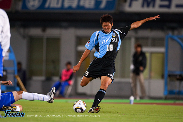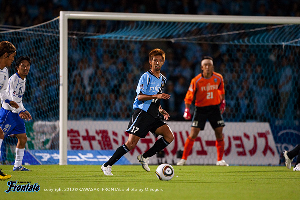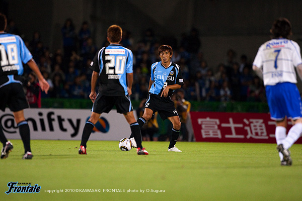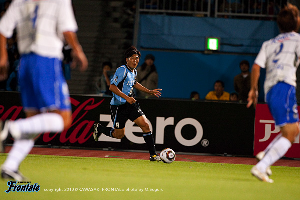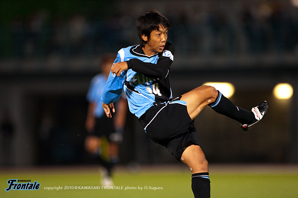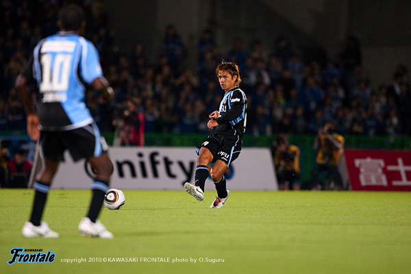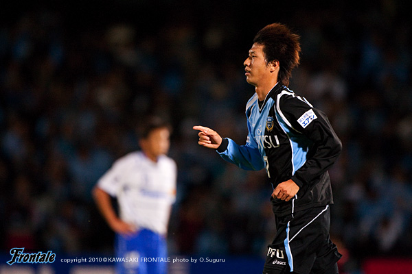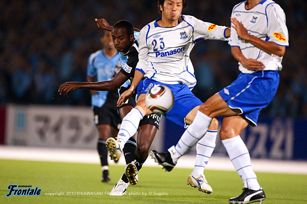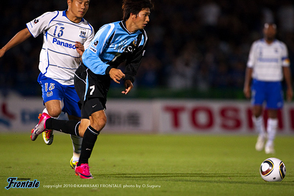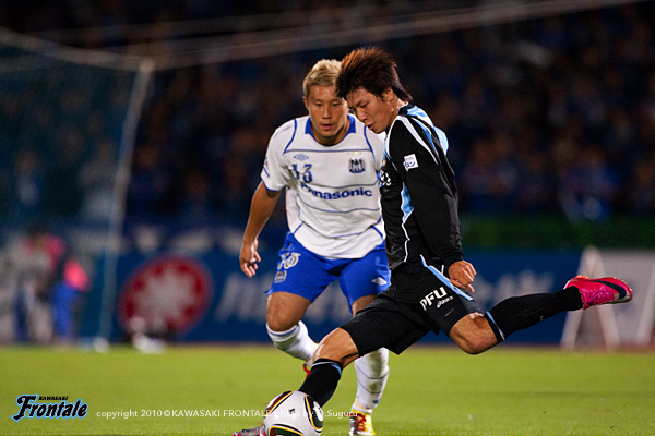 18分、横山が左サイドのスペースにスルーパス。小宮山が抜けだしクロスを入れるが、黒津はDFに挟まれシュートに持ち込めず。こぼれ球に横山が詰めるが、ミドルシュートは枠を外れる。迎えた20分、フロンターレの攻撃。中盤でボールを奪い、すぐさま田坂が裏のスペースへボールを入れ、黒津がDFと競り合いながら右足でシュートを決めて同点に追いつく。(1-1) 22分、G大阪の攻撃。遠藤のコーナーキックからゴール前で混戦となり中澤に足を出されるが、ボールはゴール左に外れる。23分、フロンターレの攻撃。G大阪陣内でミスを拾ってジュニーニョがシュート。こぼれ球がゴールに向かい黒津が突っ込むが惜しくも合わせられず。24分、右サイドのスペースへのロングボールに黒津が追いつき、ボールをつないでジュニーニョが右サイドからシュートを放つがGKにキャッチされる。28分、G大阪の攻撃。パスをつながれスペースに宇佐美が抜け出すが、小宮山がスライディングでカバー。30分、フロンターレの攻撃。菊地のロングフィードに黒津がぎりぎりのところで追いつき折り返し。ヴィトールが走り込むが、シュートは惜しくもGKに止められる。その後は前半から飛ばすG大阪の攻撃をしのぎながらチャンスを伺う展開が続く。37分、G大阪の攻撃。スルーパスに抜け出したルーカスにシュートを打たれるが、GK相澤がセーブ。こぼれ球を宇佐美に詰められるが、決定的なシュートはゴール上に外れ難を逃れる。その後も積極的にしかけ合う展開が続くが、スコアは動かず。1-1のまま前半を折り返した。