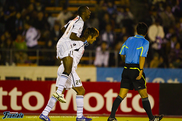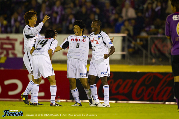 68分、直後に京都にカウンターを浴びドゥトラに飛び出されるが、GK相澤が果敢に飛び出しセーブ。危ない場面だった。71分、フロンターレの攻撃。ヴィトールのコーナーキックを黒津がニアですらすが、DFにクリアされる。72分、京都の攻撃。コーナーキックをしのがれ決定的なカウンターを浴び、5対3の数的優位を作られるが、ラストパスが合わず難を逃れる。その後も京都に圧力をかけられ押し込まれる時間が続くが、迎えた75分、矢島からボールを受けた黒津が右サイドから切れ込み強烈なミドルシュート。ワンチャンスを沈めて勝ち越し点を挙げる。(2-1) 76分、稲本に代えて横山がピッチへ。76分、フロンターレの攻撃。中盤でヴィトールがパスカット。カウンターからヴィトールのラストパスを受けたジュニーニョがシュートを放つが、GKにキャッチされる。2枚替えで勝負に出る京都。フロンターレも82分、ヴィトールに代えて谷口を投入。しかし85分、京都の攻撃。ペナルティーエリア右前からフリーキックを与え、ディエゴのシュートはGK相澤が好セーブでしのぐが、こぼれ球を拾われ、中村太のクロスを郭に落とされ、これを中村充に決められ同点に追いつかれてしまう。(2-2) しかし直後の86分、左サイドの小宮山からのスルーパスを受けた中村が左サイド深い位置から意表を突いて左足でシュート性のボールを入れ、これがゴールネットに吸い込まれ、フロンターレが再び勝ち越し。(3-2) さらに88分、矢島が左サイドからDFを引き連れながら強引にドリブル突破。そのまま深い位置に持ち込み、折り返し。このボールをジュニーニョが落ち着いて決めて、追加点を挙げる。(4-2) しかし粘る京都はロスタイム、自陣からパスをついてドゥトラがアーリークロス。このボールを金にピンポイントで合わされ、1点差に追いすがられる。その後も京都に攻勢をかけられる時間が続くが、ぎりぎりのところでチームディフェンスでしのぎ、4-3でタイムアップ。