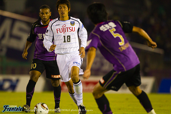17分、フロンターレの攻撃。カウンターから押し込み田坂が左サイドへ展開。矢島がシュートに持ち込むが、ここはDFにブロックされる。その後は京都に押し込まれる時間帯が続くが、ディフェンス陣が集中を切らさず守り相手のミスを誘う。しかし迎えた29分、水本のロングボールからゴール前で混戦となり、抜け出したドゥトラにシュートを決められ同点に追いつかれてしまう。(1-1) 31分、京都の攻撃。ボールを奪われカウンターを浴び最後は染谷がミドルシュートを打たれるが、これは枠を外れる。34分、フロンターレの攻撃。京都の攻勢をしのいで矢島がドリブルからボールキープ。中村からパスを受けたジュニーニョが強烈なミドルシュートを放つが、このボールはゴール右に外れる。36分、中盤でジュニーニョがルーズボールを拾ってスルーパス。矢島がゴール前に迫るが、惜しくもシュートに持ち込めず。38分、中村が右サイドに展開。森がクロスを入れるが、GKがパンチング。こぼれ球を拾った中村がミドルシュートを放つが、惜しくもゴール上に外れる。41分、京都の攻撃。ロングボールのこぼれ球を拾った安藤にシュートを打たれるが、枠を大きく外れる。ロスタイム、フロンターレの攻撃。自陣で稲本がパスカット。そのままカウンターに持ち込むが、田坂のラストパスは惜しくも通らず。フロンターレが幸先良く先制したものの、前に圧力をかける京都にキック&ラッシュで追いつかれる展開。前半を1-1で折り返した。