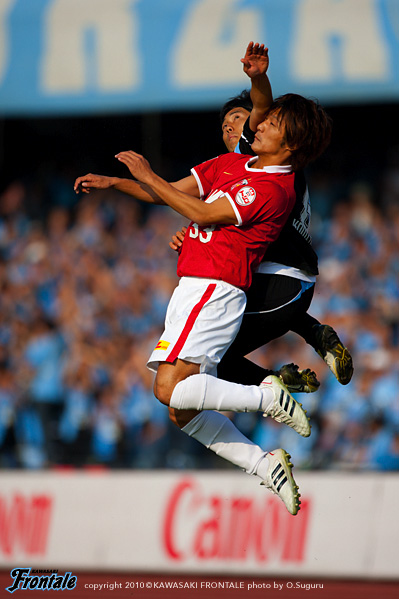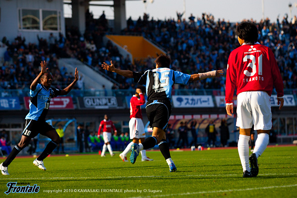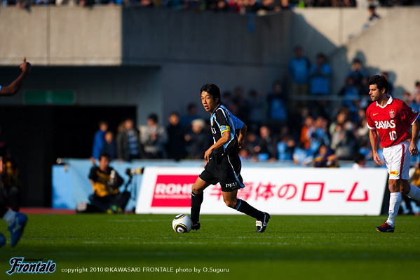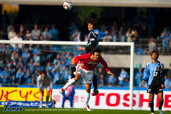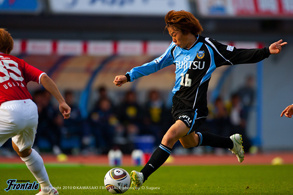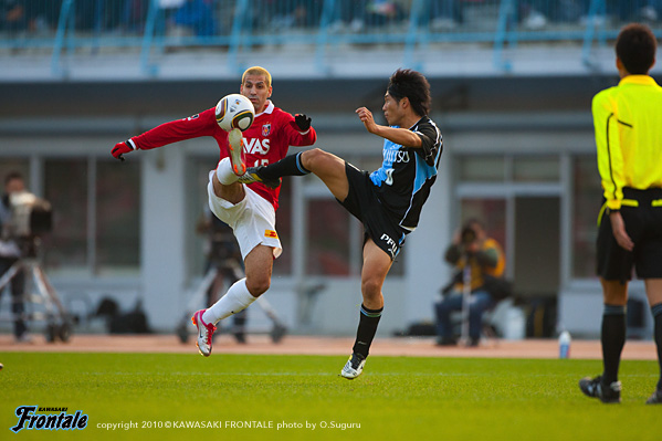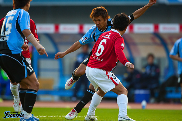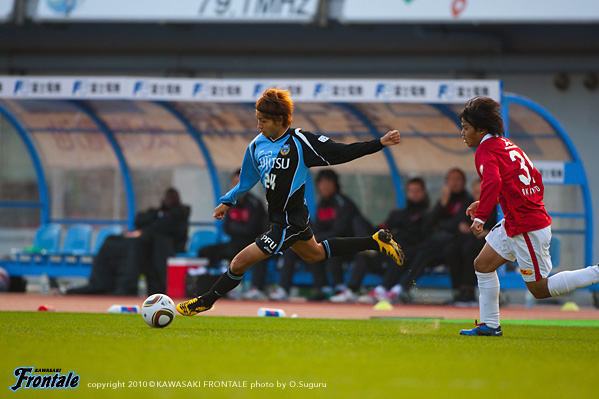 24分にもルーズボールを拾って中村が浮かし球を入れるが、走り込んだジュニーニョには通らず。26分、浦和の攻撃。エジミウソンのポストプレーからポンテがドリブル。右サイドからシュートを打たれるが、GK相澤が好セーブでしのぐ。27分、フロンターレの攻撃。パスをつないでジュニーニョがスルーパス。黒津が左サイドを抜け出し折り返しを入れるが、惜しくもゴール前でクリアされる。28分、浦和の攻撃。裏のスペースに抜け出した柏木に折り返しを入れられ、ゴール前にサヌが入りこむが、菊地が体を張って対応。31分、フロンターレの攻撃。中盤でパスをつなぎ、ジュニーニョのダイレクトパスに楠神が抜け出しドリブル突破。そのままシュートに持ち込むが、惜しくもGKに止められる。さらにこぼれ球を拾って横山が左足でミドルシュートを放つが、こちらも惜しくも枠を外れる。33分、浦和の攻撃。フロンターレのセットプレーからカウンターを狙われるが、ゴール前でどうにかしのぐ。35分、フロンターレの攻撃。中央からのフリーキック。中村からのボールを横山がヘッドで合わせるが、GKの好守に阻まれる。39分、小宮山のサイドチェンジを受けた楠神が右サイドで粘り、中村がミドルシュートを放つが、DFにブロックされる。40分、右サイドから崩しをかけて中村がアーリークロス。このボールを矢島がヘッドで合わせるが枠を外れる。42分、浦和の攻撃。パスをつながれ左サイドから崩しをかけられ、宇賀神がクロス。しかし、このボールはGK相澤がキャッチ。43分には右サイドから崩しをかけられ岡本にクロスを入れられ、ゴール前で混戦に。最後はポンテにシュートを打たれるが、このボールは枠を外れる。44分にもゴール前に圧力かけられペナルティーエリアに入られるが、ディフェンス陣が体を張って対応。1-0のリードで前半を折り返した。