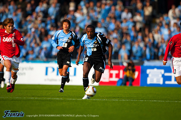 フロンターレのスターティングメンバーは、ジュニーニョと矢島の2トップ、中盤右に黒津、左に楠神、中村と横山のダブルボランチ。小宮山-菊地-井川-伊藤の最終ライン。GK相澤。立ち上がり数十秒、フロンターレがファーストチャンスをものにする。黒津のポストプレーからジュニーニョが右に流し、伊藤がアーリークロス。ファーサイドへのボールを矢島がヘッドで合わせ、フロンターレがいきなり先制点を挙げる。(1-0) さらに1分、中村が左サイドに展開。パスを受けた小宮山のクロスに矢島が入り込むが、ヘディングシュートはタイミングが合わず。3分、中村の裏のスペースのボールにジュニーニョが抜け出し、左サイドから折り返しを入れるが、ここはGKにキャッチされる。6分、浦和の攻撃。柏木からパスを受けたサヌに左サイドからドリブルをしかけられるが、GK相澤が飛び出しキャッチ。8分、フロンターレの攻撃。カウンターからジュニーニョがドリブル。左サイドから折り返しを入れるが、惜しくもDFにクリアされる。9分、直後に浦和が反撃。右サイドから崩しをかけられ高橋にクロスを入れられるが、サヌのシュートは枠を外れる。10分、フロンターレの攻撃。中盤で中村がダイレクトではたき、黒津が右サイドをドリブル。スルーパスにジュニーニョが抜け出すが、このプレーは惜しくもオフサイド。パスをつなぐ浦和に対し、落ち着いてディフェンスを展開しながらカウンターを狙うフロンターレ。19分、フロンターレの攻撃。セカンドボールを拾って押し込み、中村からパスを受けた楠神がミドルシュートを放つが、惜しくもゴール上に外れる。23分、矢島のポストプレーからジュニーニョがミドルシュートを放つが、これは枠を外れる。