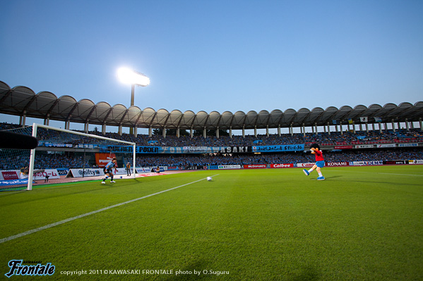 第3節福岡戦。3試合ぶりのホームゲーム。連敗しないためにも結果にこだわり、等々力のサポーターの前で勝利を挙げたい。陽が落ちてきた等々力陸上競技場。19:04キックオフ。