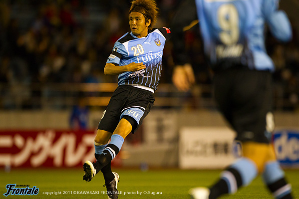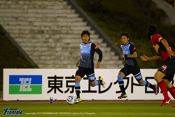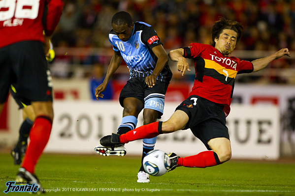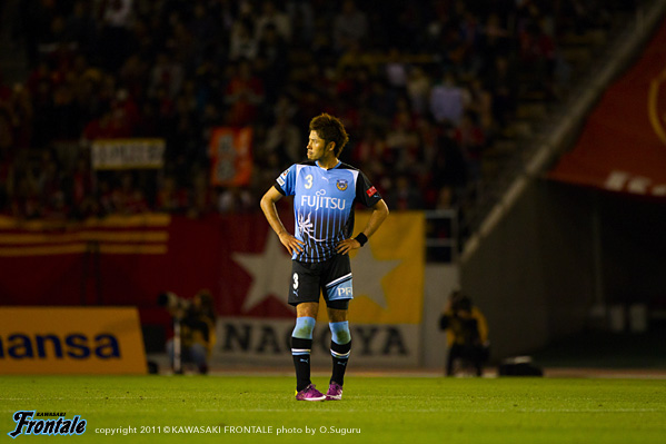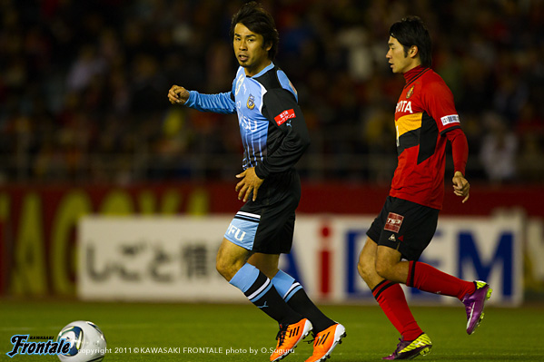 23分、名古屋の攻撃。右サイドから崩しをかけられ、玉田からボールを受けたケネディが反転されシュートを打たれるがゴール上に外れる。危ない場面だった。26分、フロンターレの攻撃。田中裕のロングボールに山瀬が走り込むがDFに挟まれる。27分、中盤でボールを奪い中村がスルーパス。登里が右サイドから走り込むがDFにカットされる。29分、田坂の右コーナーキックを矢島がヘッドで合わせるが、惜しくもゴール右に外れる。30分、中盤から中村がスルーパス。登里がヒールで流すが田坂にはタイミングが合わず。31分、名古屋の攻撃。左サイドから崩しをかけられるが、小川の突破は登里が戻ってカバー。33分、お互いにカウンターを狙うが決まらず。迎えた34分、ロングボールを受けたケネディにキープされ、落としたボールを玉田に右足で決められ先制点を奪われる。(0-1) 35分、フロンターレの攻撃。右サイドに流れた山瀬のクロスに矢島がダイビングヘッドで合わせるが、シュートはゴール右に外れる。37分、名古屋の攻撃。中盤でボールをつながれ中村直にミドルシュートを打たれるが、これはGK杉山の正面。39分、フロンターレの攻撃。カウンターからボールをつなぎ中村が強烈なミドルシュートを放つが、惜しくもGKに阻まれる。42分、左サイドから攻勢をしかけて山瀬がシュートを放つが、DFにブロックされる。43分、田中裕のスルーパスに抜け出した矢島が右サイドから折り返しを入れるが、DFにクリアされる。さらに45分、山瀬が左サイドをドリブル突破。折り返しを矢島がワンタッチで合わせてゴールネットを揺らすが、このプレーは惜しくもオフサイドの判定。立ち上がりからシュートを意識して攻勢をかけるもののゴールを奪えず。逆に個の力で打開され先制点を許してしまった。0-1で前半を折り返した。