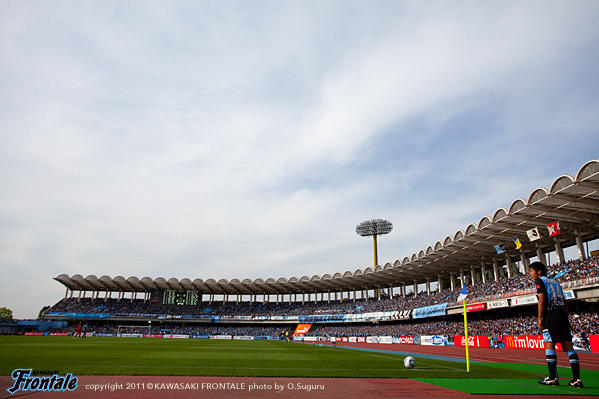 第11節、鹿島戦。ここから鹿島、C大阪、G大阪とACL出場チームとの対戦が続く。その初戦となるホームゲームで勝点3を取り、チームを上昇気流に乗せたいところ。晴天の等々力陸上競技場。16:03キックオフ。