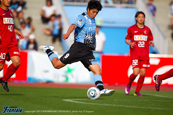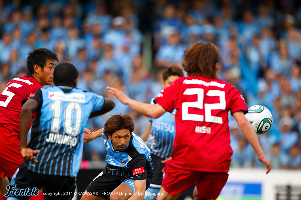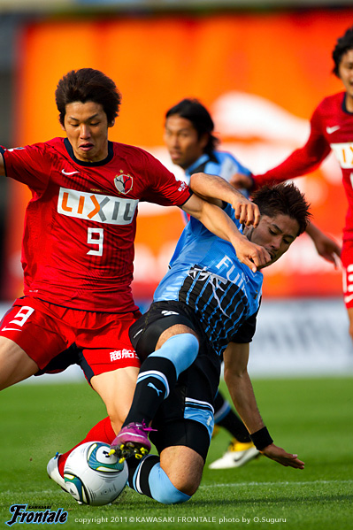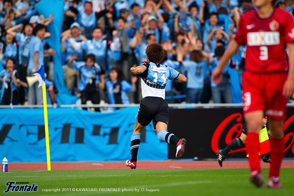 20分、相手GKのキックに矢島が触り、こぼれ球に菊地が詰めるが、惜しくもGKに止められる。21分、右コーナーキック。中村からのボールを矢島が競り合い、こぼれ球を山瀬がダイレクトで合わせるが、シュートは惜しくも枠を外れる。22分、鹿島の攻撃。遠藤に左サイドをドリブルで抜けられ、深い位置から折り返しを入れられるが、ゴール前でどうにかしのぐ。27分、右サイドから崩しをかけられるが、西のオーバーラップは登里がカバー。30分、リスタートから小笠原にスルーパスを入れられるが、GK相澤がキャッチ。迎えた31分、フロンターレの攻撃。早いタイミングのリスタートから中村が縦パスを入れ、矢島のポストプレーからのスルーパスを受けた山瀬が左サイドから強烈なシュートを放ち、追加点を挙げる。(2-0) 34分、鹿島の攻撃。右サイドから遠藤にクロスを入れられるが、井川が大迫にマークにつきGK相澤がキャッチ。35分、フロンターレの攻撃。中村のロングボールを矢島がヘッドですらし、ここに田中裕が走り込むがGKにキャッチされる。39分、鹿島の攻撃。カウンターからボールをつながれ野沢に強烈なミドルシュートを打たれるが、GK相澤がセーブ。さらにこぼれ球を折り返されるが、GK相澤がキャッチ。危ない場面だった。41分、フロンターレの攻撃。相手陣内でボールを奪い、登里からボールを受けた矢島が強烈なミドルシュートを放つが、惜しくもゴール右に外れる。42分、鹿島の攻撃。左サイドから圧力をかけられるが、最終ラインと柴崎で対応。ロスタイム46分、フロンターレの攻撃。ゴール前でパスをつなぎジュニーニョがシュート。ブロックされたボールを矢島がキープするが、フィニッシュには持ち込めず。立ち上がりから攻勢をかけるフロンターレがセットプレーから先制。その後も試合の主導権を握り、山瀬のゴールで追加点。2-0のリードで前半を折り返した。