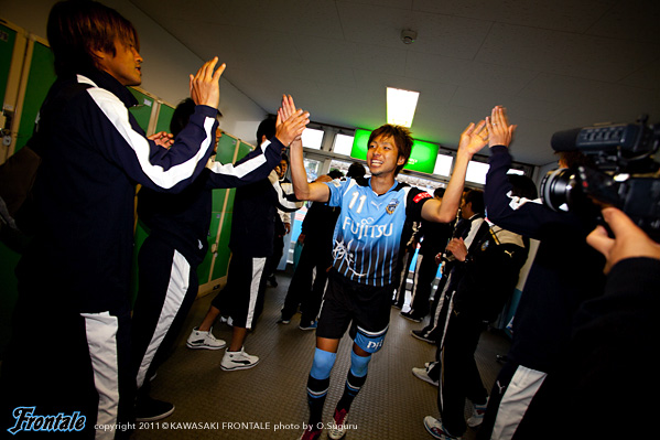ハーフタイムのロッカールーム。「後半、いつもやられている。最初からしっかりゲームに入っていこう」と小宮山。「みんなでサポートしあって最後までやりきろう!」と中村も声をかける。46分、鹿島の攻撃。ファーストプレーからワイドに展開され、右サイドの野沢にクロスを入れられ興梠にヘッドで合わされるが、シュートはゴール右に外れる。危ない場面だった。47分、フロンターレの攻撃。右サイドの田中裕からパスを受けた山瀬がクロスを入れるが、GKにキャッチされる。49分、鹿島の攻撃。右コーナーキックの場面。野沢からのボールを岩政にヘッドで合わせられるが、シュートは枠を外れる。しかし迎えた50分、右サイドから崩しをかけられ、野沢のアーリークロスを遠藤に合わせられて鹿島に1点を返される。(2-1) 51分、フロンターレの攻撃。小宮山のスルーパスに反応した登里が左サイドから折り返し。走り込んだジュニーニョが合わせるが、シュートは惜しくもゴール右に外れる。55分、柴崎からパスを受けた山瀬が右サイドから切れ込み左足を振り抜くが、このミドルシュートはGK正面。56分、鹿島の攻撃。中盤からロングパスで裏のスペースを狙われ大迫に走り込まれるが、GK相澤がキャッチ。57分、フロンターレの攻撃。矢島のロングパスに追いついた登里が右サイドから折り返しを入れるが、DFに当たってGKにキャッチされる。60分、登里に代えて横山が入りボランチへ。中村が1列上がった布陣にシフト。61分、鹿島の攻撃。サイドチェンジからゴール前に迫られるが、小宮山がクリア。62分にもピッチをワイドに使われ、野沢にドリブル突破からシュートに持ち込まれるが、これはゴール上に外れる。さらに63分、右サイドからボールをつながれ遠藤にシュートを打たれ、山瀬に当たってコースが変わるが、GK相澤がビッグセーブでしのぐ。危ない場面が続く。