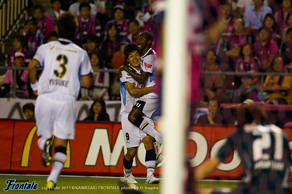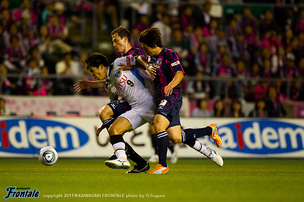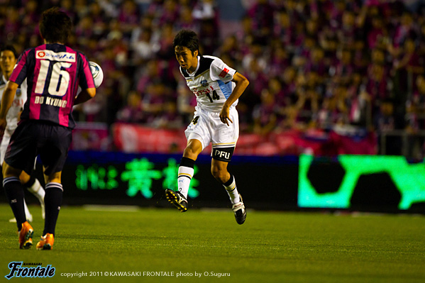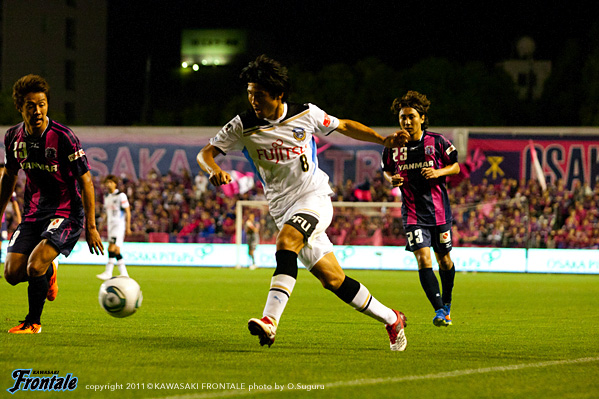 24分、左サイドの登里からボールを受けた山瀬がミドルシュートを放つが、このボールはDFに当たって枠を外れる。25分、C大阪の攻撃。キムボギョンの大きなサイドチェンジには田中裕が対応。27分、乾のドリブル突破から高橋がエリア内に入ってくるが、中村がついて対応。GK相澤がキャッチ。迎えた29分、C大阪の攻撃をしのいでジュニーニョを起点にカウンターへ。山瀬とのパス交換から矢島が左サイド深い位置から強烈なシュートをサイドネットに突き刺し追加点を挙げる。(2-0) 30分、C大阪の攻撃。ボールをつながれバイタルエリアに迫られるが最終ラインで対応。31分、フロンターレの攻撃。右サイドの田中裕からボールを受けたジュニーニョがミドルシュートを放つがゴール上に外れる。32分、C大阪の攻撃。前に圧力をかけられルーズボールがゴール前に出るが、ボールを受けたピンパォンはオフサイド。34分、フロンターレの攻撃。ボールをつないで右サイド田中裕が速いクロスを入れ、柴崎がダイレクトで合わせるが惜しくもGKにキャッチされる。37分、C大阪の攻撃。ペナルティーエリア前からのフリーキック。乾のシュートは壁に当たり田中裕がクリア。40分、フロンターレの攻撃。田中裕がボールを奪いカウンターへ。矢島のスルーパスに山瀬が飛び込むが、わずかにタイミングが合わずGKにキャッチされる。41分、柴崎が中盤から長い距離をドリブル。そのまま左サイドからシュートに持ち込むが、惜しくもゴール左に外れる。42分、自陣からつないでカウンターへ。登里の裏へのボールにジュニーニョが走り込みループシュートを狙うが、惜しくもゴール左に外れる。立ち上がりから積極的にしかけるフロンターレが主導権を握り、山瀬のゴールで先制。さらにカウンターがぴたりとはまり、矢島のゴールで追加点。2-0のゴールで前半を折り返した。