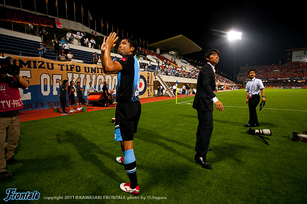 - やっと勝った。J1に上がった2005年から6連敗。自分が入ってから勝点1すら取ることができなかった日本平で、ようやく勝点3を取ることができた。1人少なくなってからは逆にやることがはっきりした部分がある。2-0から追いつかれたのはチームとして課題だが、こちらが10人になってからは相手の方から崩れてしまった感じがあった。個人的には後半から出て45分間、十分に走った。日本平で勝てなくてサポーターもずっと悔しかったと思うし、この勝利をみんなに捧げたい。この連戦で結果が出ているので、次が大事。鹿島戦でもみんなでしっかり走りきりたい。
