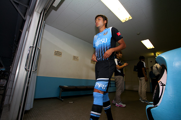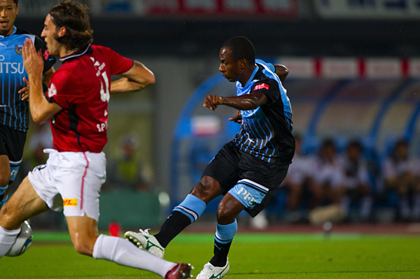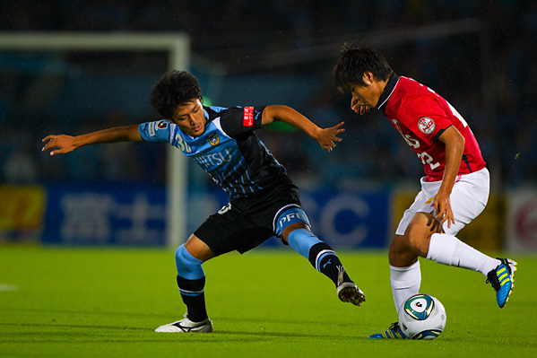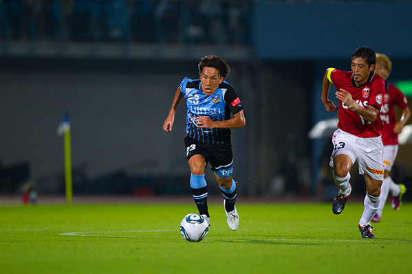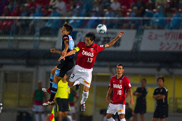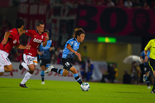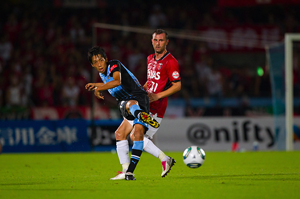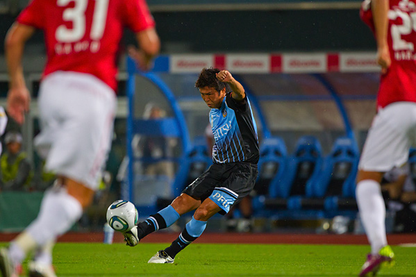 後半、フロンターレは大島に代えて中村がピッチへ。47分、フロンターレの攻撃。相手陣内で井川がボールカット。スルーパスに小林が走り込むがチャンスにつなげず。50分、ペナルティーエリア左からのフリーキック。中村が速いボールを入れるがクリアされる。さらにボールをつないで井川がロングシュートを放つがGKにキャッチされる。51分、中央からジュニーニョがドリブル突破。こぼれ球に詰めた登里が左サイドからミドルシュートを放つが、このボールはゴール左上に外れる。52分、中村のパスをジュニーニョがはたき山瀬が右サイドからシュートを放つが、惜しくもGKに止められる。53分、浦和の攻勢をしのいで田坂が前線へ展開。ジュニーニョが追いつき左サイドからシュートに持ち込むがDFにブロックされる。54分、中村の左コーナーキックを小林がヘッド叩きつけるが、このシュートはGKにキャッチされる。54分、浦和の攻撃。直後にカウンターを浴び、クロスをフリーの山田直に合わされるがボールは枠を外れる。危ない場面だった。56分、自陣からボールをつながれ決定的なラストパスが原口に入るが、GK相澤が飛び出しセーブ。58分、フロンターレの攻撃。エリア左前からのフリーキック。ここで田坂が直接シュートを狙うが惜しくもクロスバーに当たって外れる。63分、小宮山が左サイドでボールキープ。パスを受けた登里が抜け出し左サイド深い位置からクロスを送るが、このボールはGKにキャッチされる。63分、浦和の攻撃。左サイドに流れたデスポトビッチがクロス。マルシオに飛び込まれ、はね返りのボールがゴールに向かうがGK相澤が横っ飛びでキャッチ。危ない場面だった。65分、浦和の攻撃。ペナルティーエリア右からのフリーキック。柏木のボールからゴール前で混戦となり、鈴木にシュートを打たれるがゴール上に外れる。危ない場面が続く。