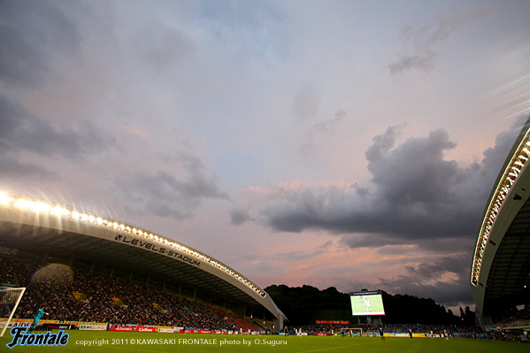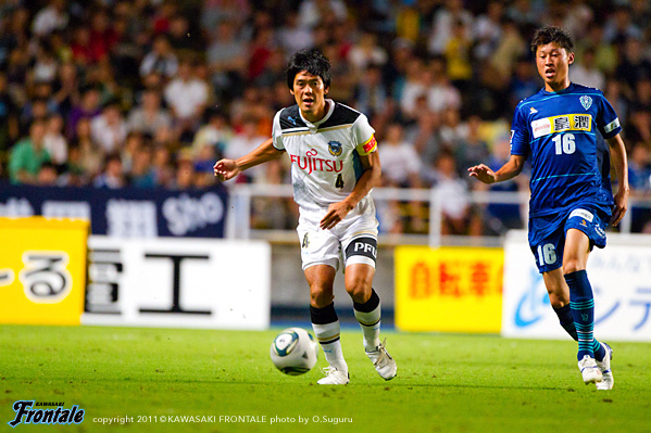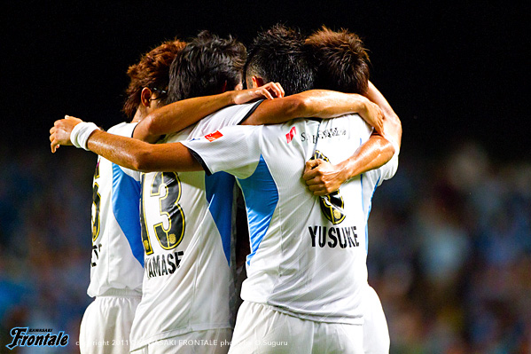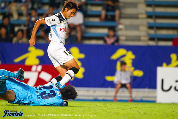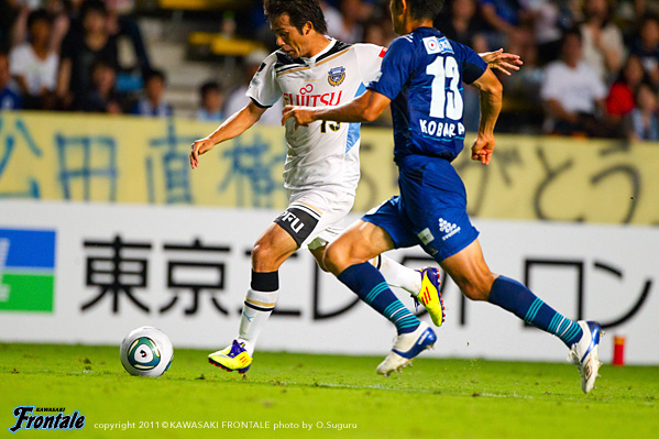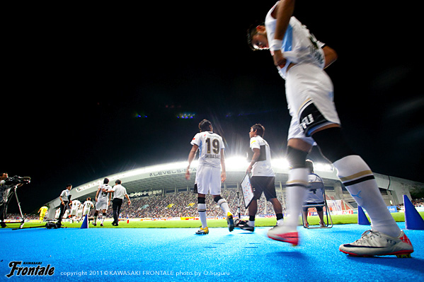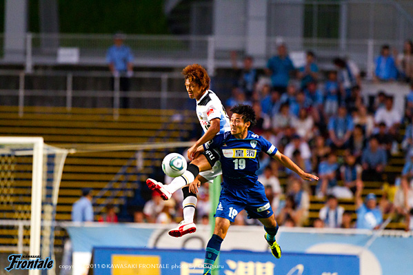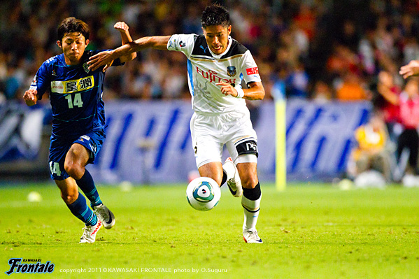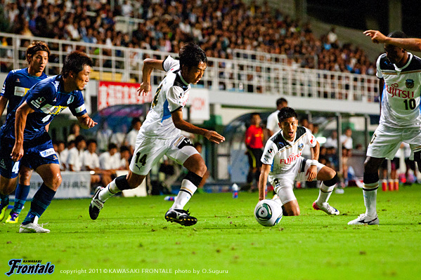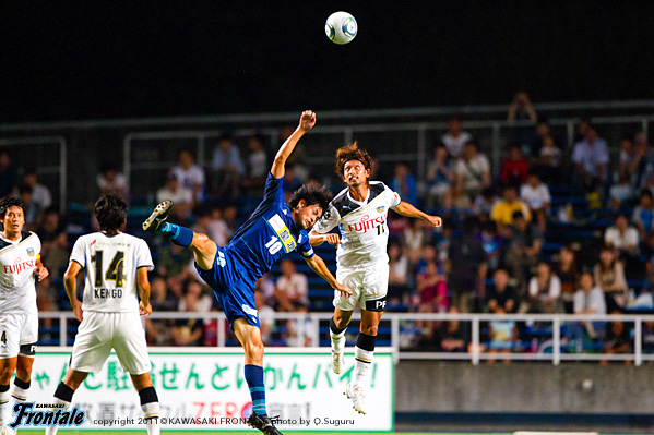 すると迎えた68分、クリアボールを中盤で拾われ、ショートカウンターから裏へのボールに抜け出した城後にシュートを決められ同点に追いつかれる。(1-1) 69分、フロンターレの攻撃。中盤でボールをつないで押し込み、右サイドの山瀬が折り返し。流れたボールを實藤が左足で合わせるがDFにブロックされる。70分、小林が右サイドから勝負をしかけて連続して折り返しを入れるが、いずれもゴール前ではね返される。71分、福岡の攻撃。セットプレーのクリアボールからカウンターを浴びるが、井川がボールホルダーに詰めて対応。危ない場面だった。72分、實藤に代えて田坂がピッチへ。73分、フロンターレの攻撃。スローインから中村が裏へボールを出し、ここに山瀬が走り込むがGKに飛び出されクリアされる。74分、福岡の攻撃。右サイドから崩しをかけられ田中佑のクロスを成岡にヘッドで合わされるが、シュートはゴール上に外れる。76分、福岡の攻撃。中盤右サイドからのフリーキック。鈴木からのボールが直接ゴールに向かうが、GK相澤が止めてゴールラインを割る。76分、左コーナーキックの場面。鈴木のボールを丹羽にヘッドで合わされるが、ゴールポストに当たって外れる。さらにはね返りを拾われるが松浦の右サイドからのシュート性のボールはディフェンス陣がブロック。78分、小林に代えて矢島が入り、79分、山瀬に代えて大島がピッチへ。大島がボランチに入り、中村が1列上がる。81分、フロンターレの攻撃。ジュニーニョが左サイドを突破。クロスに中村が飛び込むが、合わせたボールは惜しくもゴール右に外れる。83分、中村の右コーナーキックのクリアボールを拾った大島がシュートに持ち込むが、ここはDFにブロックされる。迎えた84分、右サイドから崩しをかけられ、左サイド松浦とのパス交換からフリーの城後にシュートを打たれ、勝ち越しゴールを奪われる。(1-2) 86分、フロンターレの攻撃。中村のスルーパスを受けた矢島が右サイドから折り返しを入れるが惜しくもゴール前でDFに触われる。89分、登里が左サイドをドリブル。クロスに田中裕が飛び込み、こぼれたボールに田坂が詰めるがシュートはゴール上に外れる。ロスタイム4分。91分、右サイドの中村からボールを受けた田中裕がクロスを狙うが、DFに当たってGKキャッチされる。試合は1-2でタイムアップ。