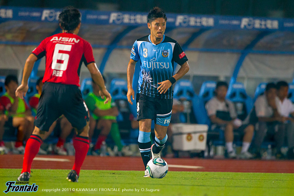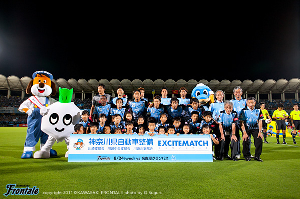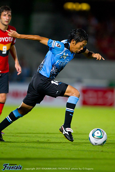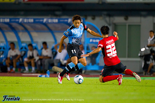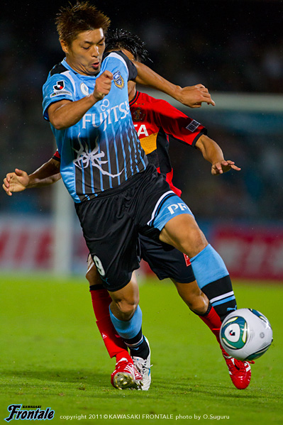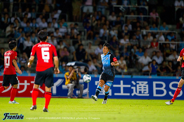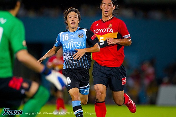 後半立ち上がり47分、フロンターレの攻撃。田中雄のインターセプトからカウンターを狙うが、左サイドからドリブルをしかけた矢島のクロスはゴール上に外れる。48分、ボールをつないで楠神からパスを受けた雄大が左サイドからミドルシュートを放つが、うまくミートせず。50分、名古屋の攻撃。フロンターレが押し込むものの逆にカウンターを受け、ケネディのクロスをフリーの小川に合わされるがシュートは上に外れる。危ない場面だった。52分、フロンターレの攻撃。中村からボールを受けた楠神が左サイドからファーサイドを狙ったクロスを入れるが、このボールはGKにキャッチされる。53分、ボールをつないで楠神がドリブルで勝負をしかけるが、ここはファールで止められる。55分、ペナルティーエリア右前からのフリーキック。中村が直接狙いGKがはじいたところにジュニーニョが詰めるが、惜しくもシュートに持ち込めず。62分、名古屋の攻撃。左サイドからのクロスのこぼれ球を拾われ混戦からシュートに持ち込まれるが、ボールはゴール左に外れる。危ない場面だった。63分、小川の左コーナーキックは田中裕がクリア。セカンドボールを拾われ再びクロスを入れられるがGK相澤がパンチングでしのぐ。64分、カウンターで危険な場面を作られるが、ゴール前でディフェンス陣が対応。危ない場面だった。65分、ピンチが続くなかで直後にフロンターレが反撃。ボールをつないで中村が左サイドへ展開。パスを受けた楠神がDFをかわして左足でシュートを決めて先制点を挙げる。(1-0) しかし楠神が足を痛めて負傷退場。67分、楠神に代えて田坂がピッチへ。68分、フロンターレの攻撃。リスタートからボールをつないで山瀬が右サイドから戻しを入れるが、このボールはジュニーニョには合わず。