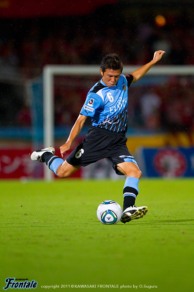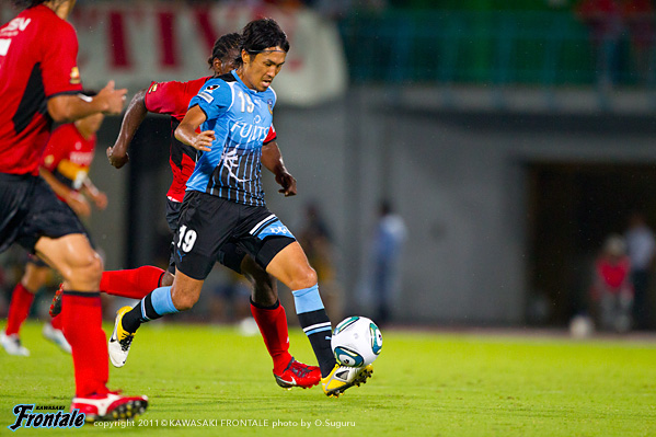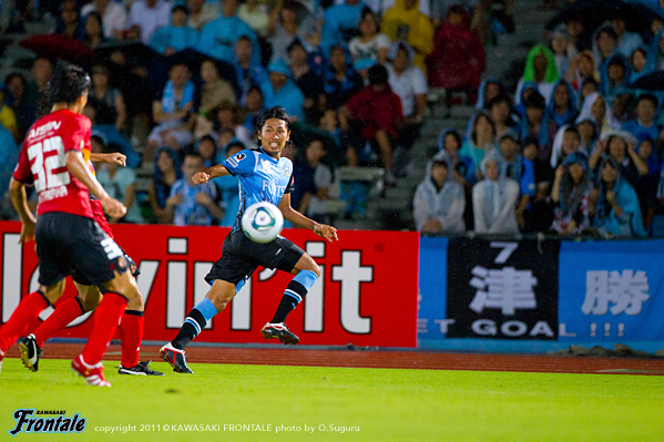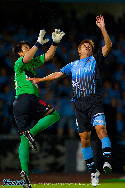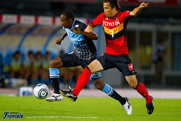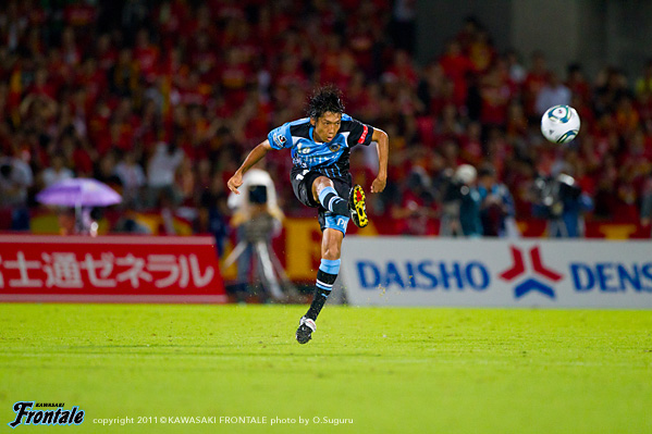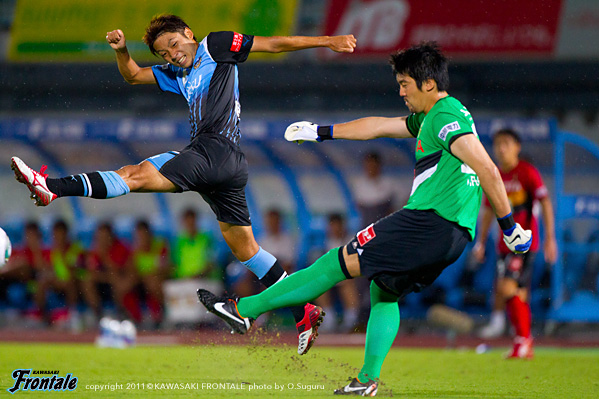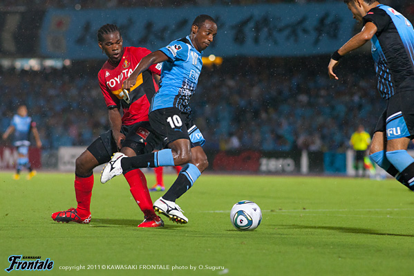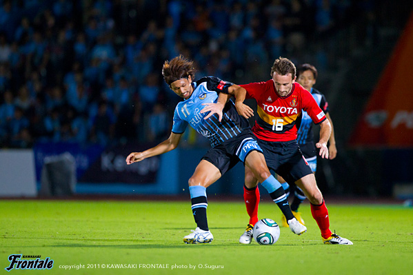 26分、カウンターを受けてオーバーラップした右サイドの田中隼にクロスを入れられ玉田にヘッドで叩きつけられるが、このシュートはGK相澤の正面。27分、ロングボールのこぼれ球を受けたブルザノビッチにフリーでシュートを打たれるが、菊地が体を張ってブロック。危ない場面だった。28分、フロンターレ。田中雄のオーバーラップから名古屋陣内に入るがフィニッシュにつなげず。29分、名古屋の攻撃。玉田に左サイドからドリブルでしかけられシュートを打たれるが、ここは井川がブロック。30分、フロンターレの攻撃。縦パスを受けた山瀬が反転して左足でミドルシュート。ブロックされたボールに詰めた雄大が左サイドからミドルシュートを放つが、このボールはゴール前を通過。31分、中盤でボールをつないで山瀬からボールを受けたジュニーニョが左足で強烈なミドルシュートを放つが、惜しくもゴール上に外れる。33分、名古屋の攻撃。右サイド田中隼のクロスをケネディにヘッドで合わされるが、シュートはゴール左に外れる。危ない場面だった。34分、フロンターレの攻撃。急に雨が降り出すなかボールをつないで押し込むが、フィニッシュにはつなげず。38分、名古屋の攻撃。セカンドボールを拾われロングボールを受けた闘莉王に左サイドからシュートを打たれるが、ゴール前ぎりぎりのところで菊地がクリア。危ない場面だった。40分、フロンターレの攻撃。ボールをつないで左サイドに抜け出した柴崎が折り返しを入れるが、惜しくもゴール前にはタイミングが合わず。41分、縦パスを受けた山瀬がDFをかわして左足でミドルシュートを狙うがうまくミートせず。42分、カウンターからジュニーニョがドリブル。スルーパスに抜け出した田中裕が折り返しを入れるが、飛び込んだ矢島はわずかに届かず。惜しい場面だった。43分、名古屋の攻撃。ケネディに右サイドから強引に突破され、折り返しのこぼれ球に反応した中村直にミドルシュートを打たれるが、DFに当たってゴール左に外れる。序盤は厳しいプレッシャーをかけてくる名古屋に押されるものの、フロンターレもじょじょに反撃。お互いに決定機をものにできず、0-0で前半を折り返した。